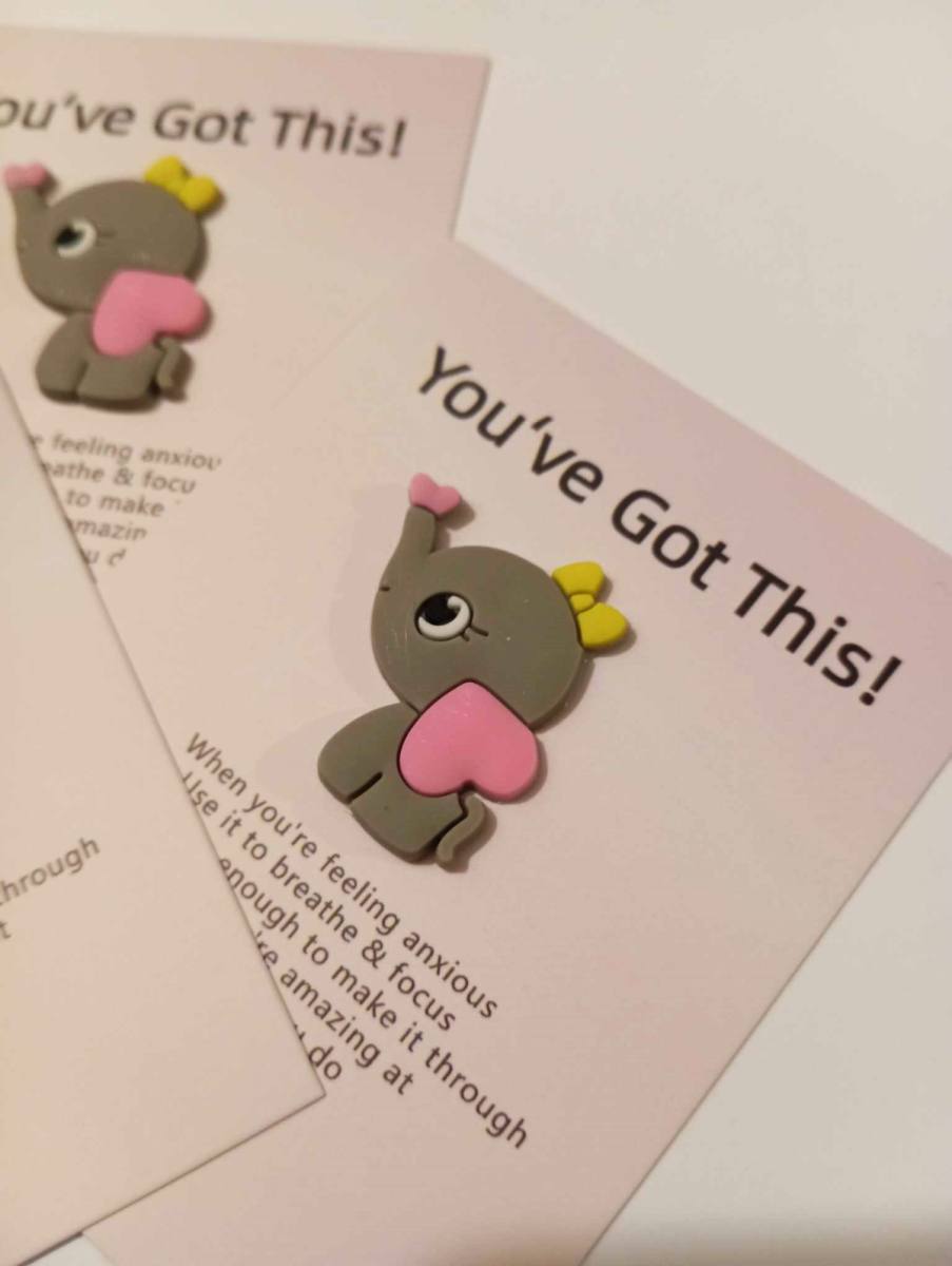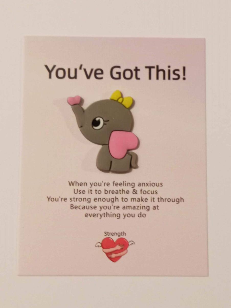 Ko te prevzamejo občutki tesnobe ali negotovosti, si vzemi trenutek zase, globoko vdihni in se osredotoči. Dovolj močan/močna si, da premagaš vse, saj si čudovit/a v vsem, kar počneš. Slonček na kartici te bo vsakič, ko ga boš pogledal/a, opomnil na tvojo moč, vztrajnost in na to, da ti je na poti vedno dana podpora, tudi ko se tega morda ne zavedaš.