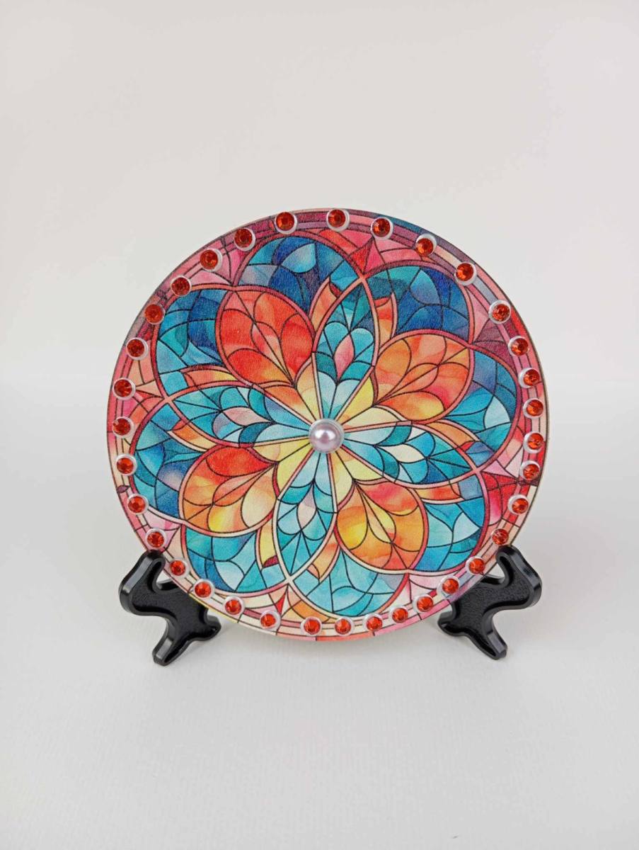 Barvni odtenki, ki se prelivajo skozi zapletene vzorce mandale, simbolizirajo različne vidike življenja – od radosti in ljubezni do modrosti in notranjega ravnovesja. Naravni les, ki služi kot platno za to mandalo, dodaja občutek pristnosti in stabilnosti, kar ustvarja globoko povezavo z naravnimi energijami. Vsaka barva ima svoj namen, in ko se združijo, ustvarijo svetlobni vrtinec, ki nas navdihuje in pomirja.