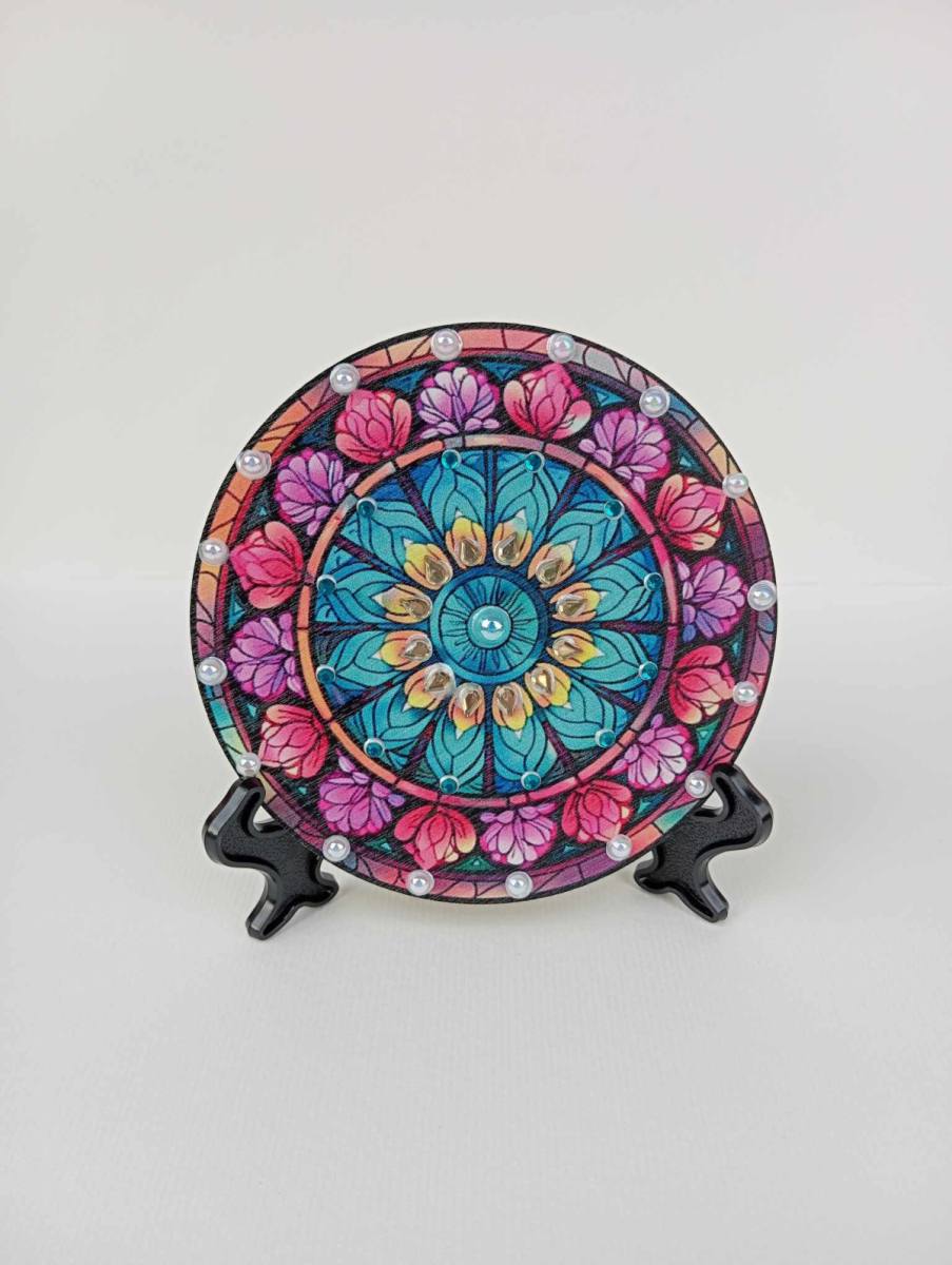 Biseri, simbol čistosti in modrosti, ter cirkoni, ki lovijo in razpršijo svetlobo, obogatijo mandalo z dimenzijo, ki presega zgolj vizualno lepoto. Ti svetleči elementi odsevajo svetlobo v vse smeri, napolnijo prostor z nežnim sijajem ter dvigujejo vibracije okolja. Mandala postane središče pozornosti, ki razsvetljuje prostor in prinaša občutek topline, miru in radosti.