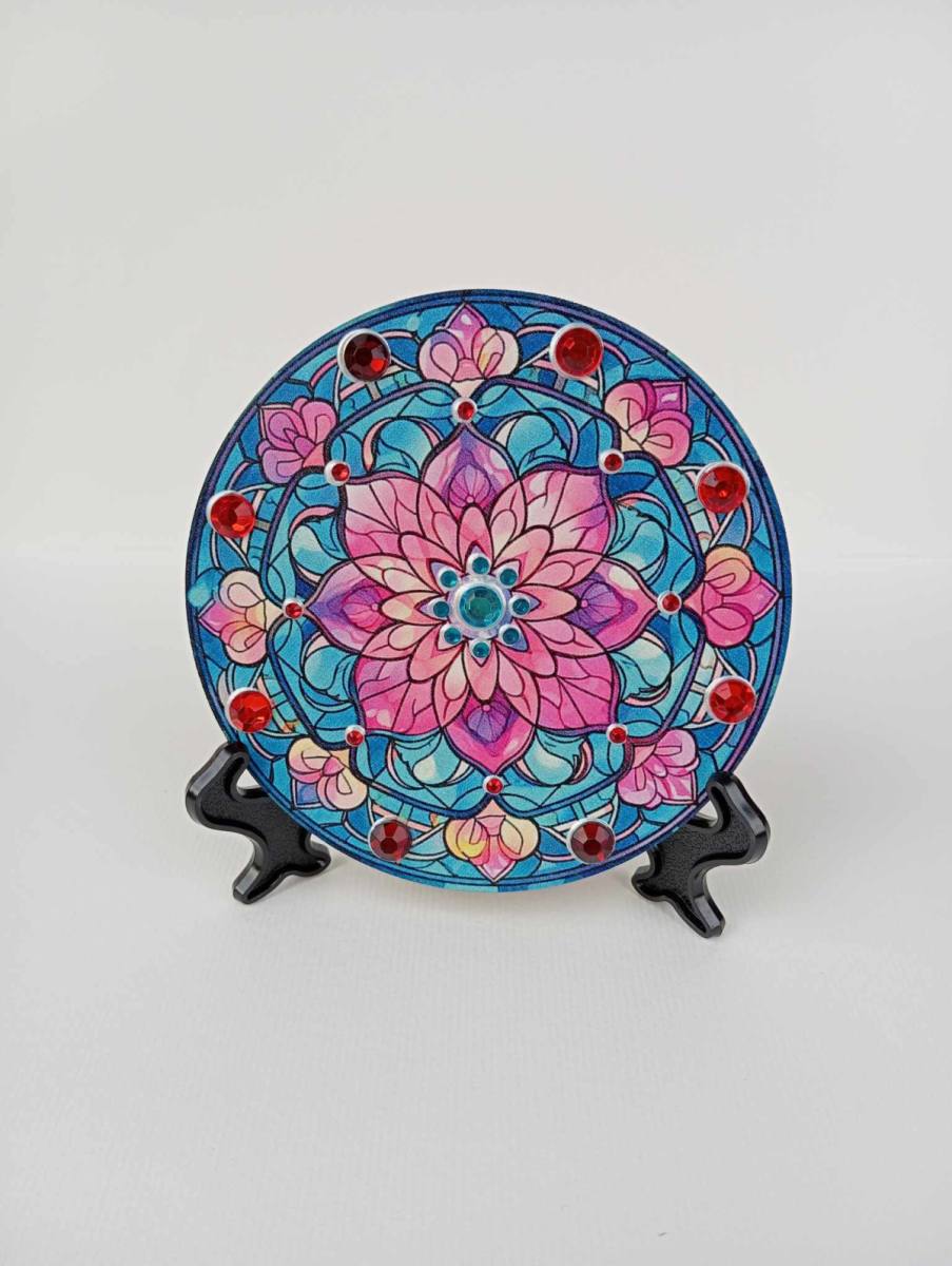 Biseri, simbol čistosti in modrosti, ter cirkoni, ki lovijo in razpršijo svetlobo, obogatijo mandalo z dimenzijo, ki presega zgolj vizualno lepoto. Ti svetleči elementi odsevajo svetlobo v vse smeri, napolnijo prostor z nežnim sijajem ter dvigujejo vibracije okolja. Mandala postane središče pozornosti, ki razsvetljuje prostor in prinaša občutek topline, miru in radosti.