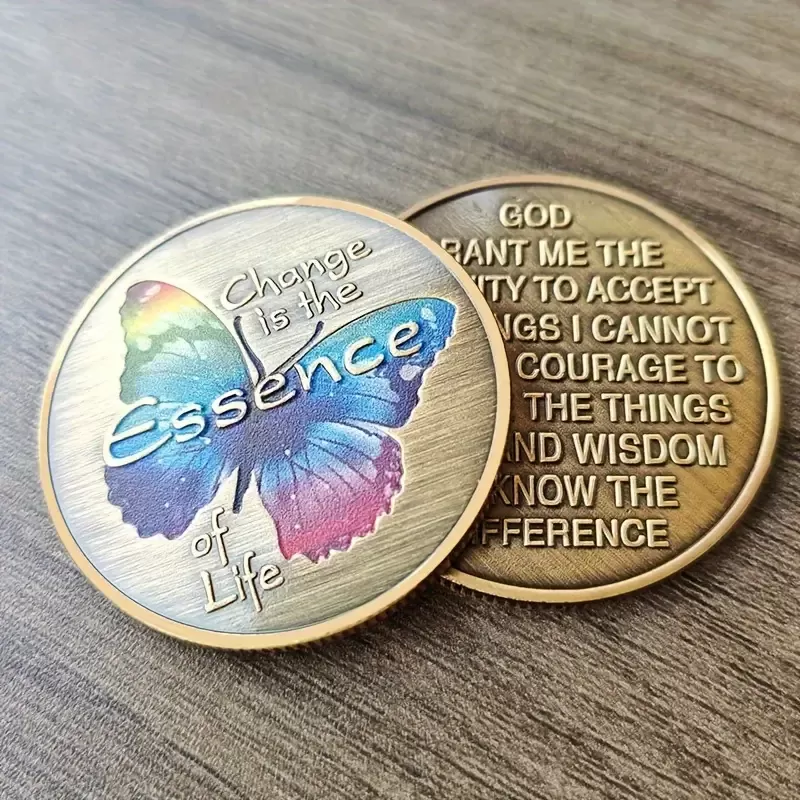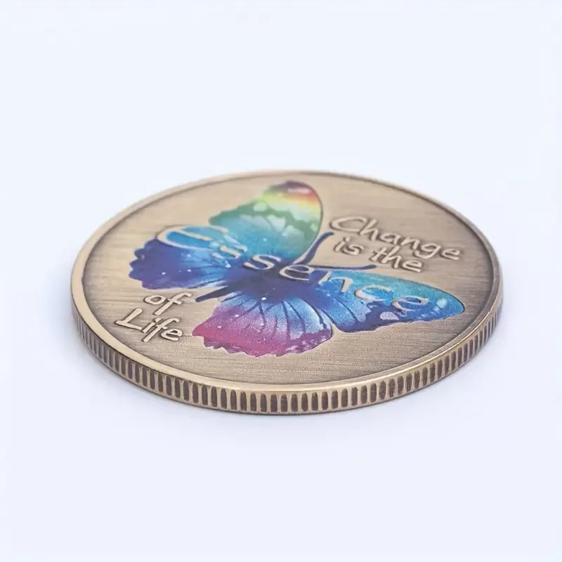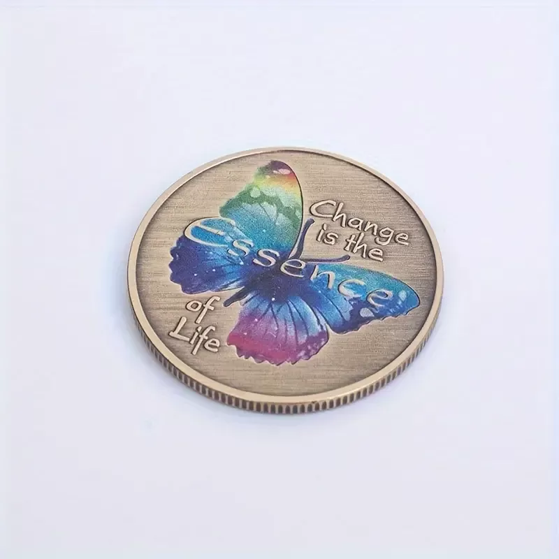 Ta čarobni amulet v obliki kovanca združuje simboliko metulja, energije preobrazbe in modrosti, ki vas podpira na vaši poti osebne rasti. Prefinjeno oblikovan kovanec, obogaten z barvito podobo metulja in navdihujočim napisom "Change is the Essence of Life", vas opominja, da je sprememba ključ do odkrivanja vašega najvišjega potenciala.