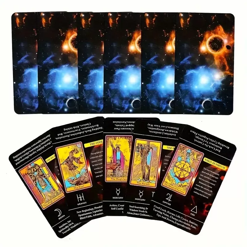 Komplet vključuje 78 tarot kart, ki so jasno oblikovane z dodanimi ključnimi besedami, kar omogoča hitro učenje osnovnih pomenov vsake karte. Karte so zasnovane tako, da vključujejo tudi elemente astrologije, numerologije in simbolike, kar bo pomagalo graditi širšo perspektivo. Vsaka karta v kompletu je povezana z unikatnimi pomeni, ki razkrivajo globlje plasti vaše intuitivne poti.
