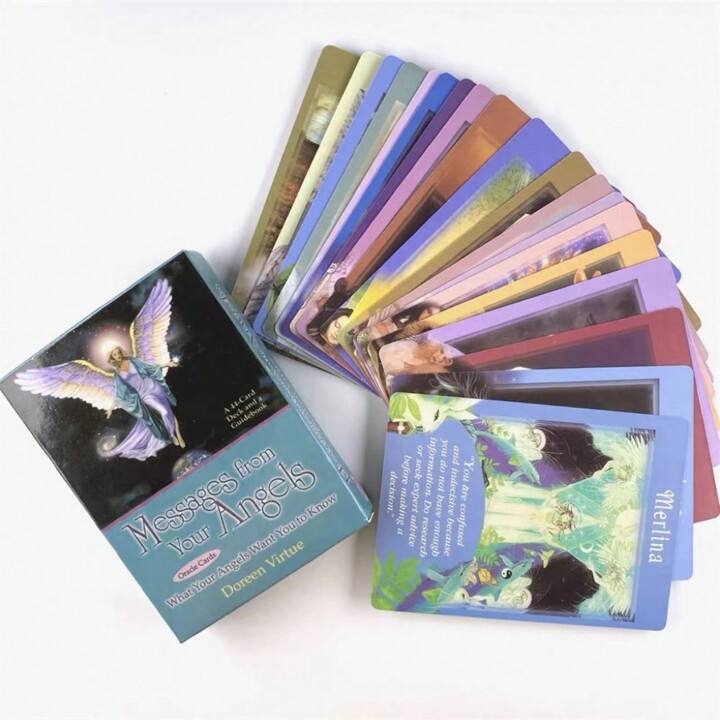 Karte "Messages from Your Angels" Doreen Virtue so angelske orakeljske karte, ki so zasnovane za iskanje duhovnih vodstev, jasnosti in spodbud pri vsakodnevnih izzivih. Komplet vsebuje 44 kart, vsaka pa je povezana z določenim angelom, ki prinaša sporočilo, nasvet ali navdih. Karte so nežno ilustrirane z angelskimi podobami in vsakokratno sporočilo ponuja globok uvid ter povabilo, da se zaupate božanskemu vodstvu.