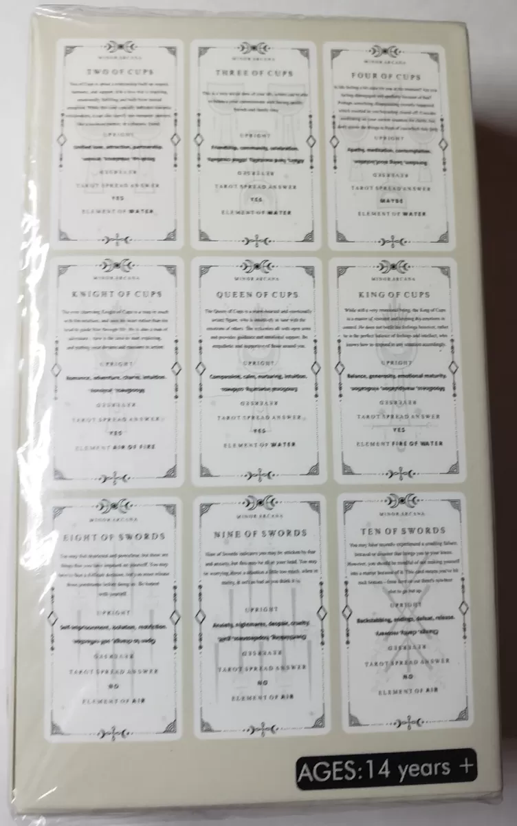 Vsaka karta v kompletu je skrbno oblikovana z namenom, da olajša razumevanje ne samo osnovnih pomenov, temveč tudi globlje energije, ki jih vsaka karta nosi. Na sprednji strani vsake karte so prikazane ključne lastnosti kart velike in male arkane, vključno z njenimi simboli, elementi in povezanimi energijami. Pokončni in obrnjeni pomeni so jasno razloženi, kar bralcu omogoča, da takoj razume, kako se energija karte izraža v različnih kontekstih.