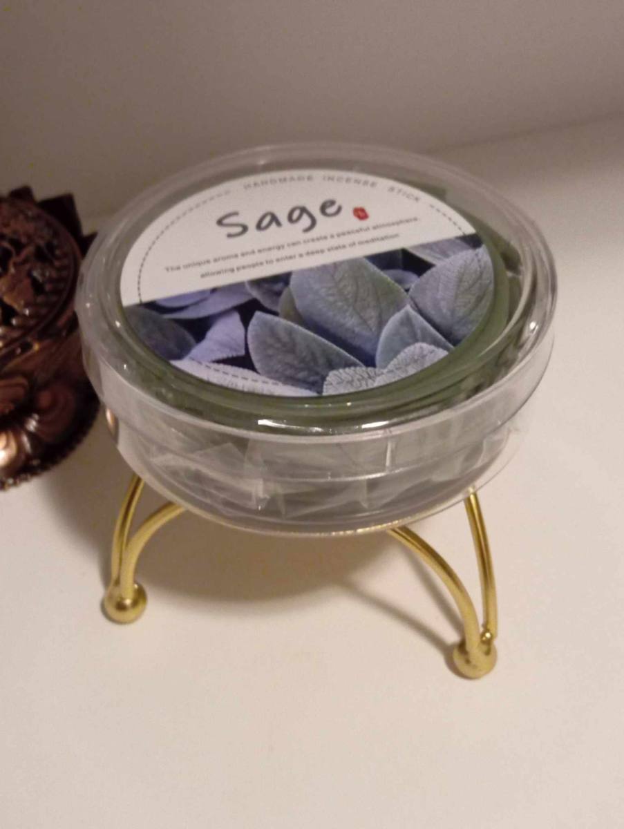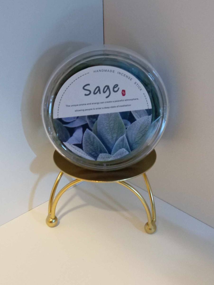 V kompletu prejmete zlat podstavek- svečnik(za večkratno dolgo uporabo)+20 spiralnih kadil belega žajbla v škatlici.