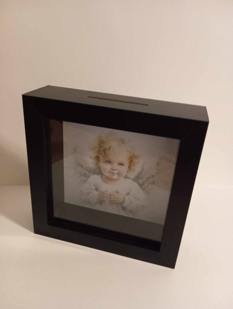 Naš hranilnik ima stekleno sprednjo ploščo, ki omogoča jasen pogled na sliko v ozadju. A to ni le običajna slika - med steklom in sliko je namreč prostor, ki je idealen za shranjevanje denarja. Ta predel omogoča, da lahko hranilnik uporabljate tako kot varno mesto za hranjenje gotovine ali pa ga preprosto postavite na vidno mesto kot izjemno dekoracijo ali sliko v vašem domu.