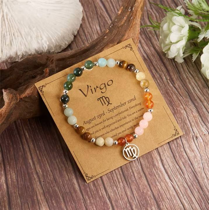 Naravni kristali na zapestnici Devici prinašajo sprostitev in občutek lahkotnosti. Kristali, ki so nastajali skozi dolge naravne procese v globinah zemlje, v sebi nosijo mirno, prizemljeno energijo. Ta energija Devici pomaga, da spusti pretiran nadzor in zaupa življenju. Kristali jo podpirajo pri soočanju s stresom, povečujejo notranji mir in ji pomagajo, da se odpre tudi svoji ustvarjalni in čustveni plati. Simbol Device na zapestnici poudari njeno sposobnost reda, skrbnosti in organizacije, kristali pa ji pomagajo, da te lastnosti uporablja brez izčrpavanja. Tako komplet postane njena opora na poti k ravnovesju med popolnostjo in sproščenostjo.