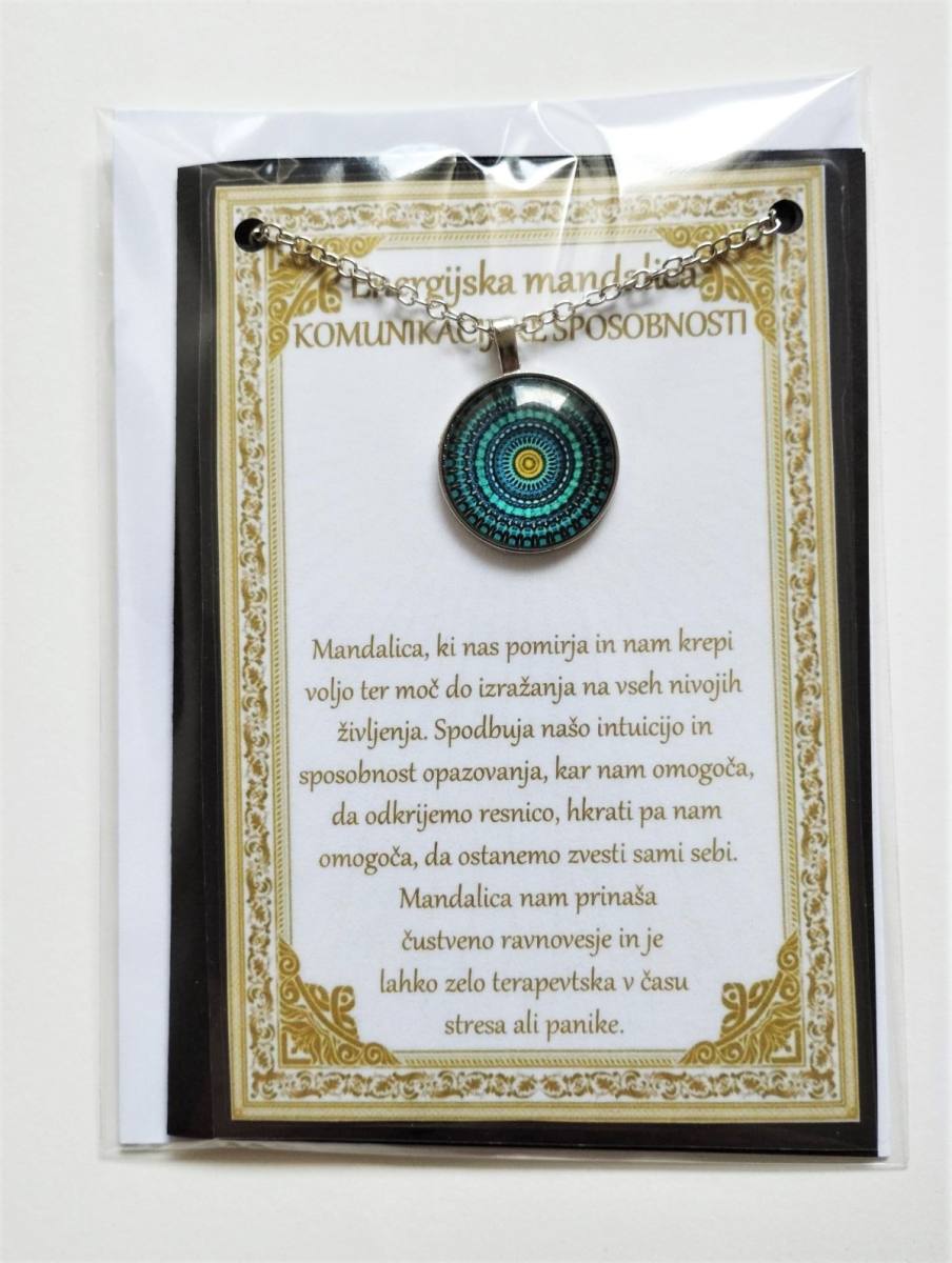 Ogrlica z energijsko mandalo je v darilni embalaži. Ta je v obliki vizitke, z opisom v cerificiranem plastificiranem okvirju, kar pomeni, da je lahko tudi čudovito darilo nekomu, ki nam je blizu.