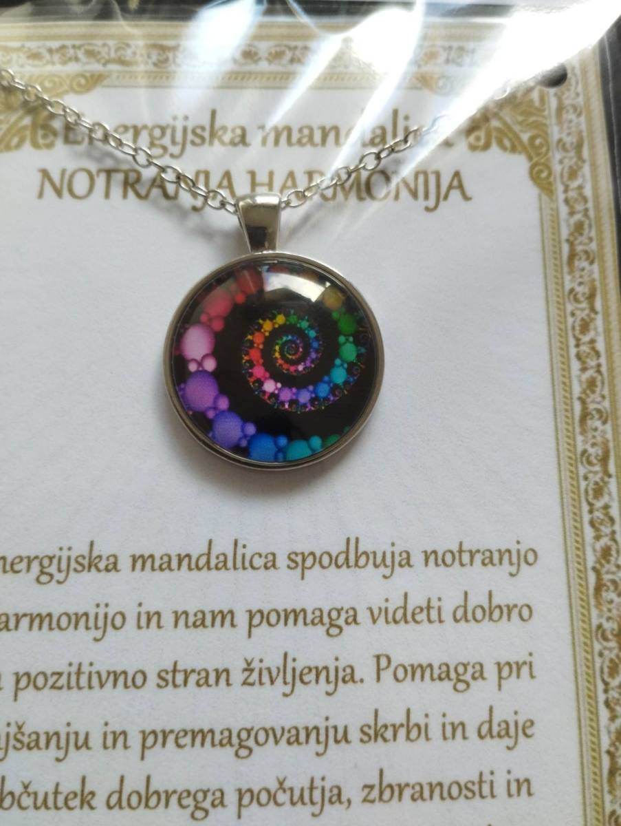 Ogrlica z energijsko mandalo je v darilni embalaži. Ta je v obliki vizitke, z opisom v cerificiranem plastificiranem okvirju, kar pomeni, da je lahko tudi čudovito darilo nekomu, ki nam je blizu.