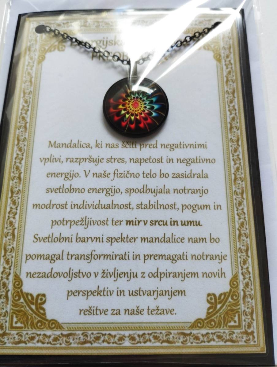 Ogrlica z energijsko mandalo je v darilni embalaži. Ta je v obliki vizitke, z opisom v cerificiranem plastificiranem okvirju, kar pomeni, da je lahko tudi čudovito darilo nekomu, ki nam je blizu.