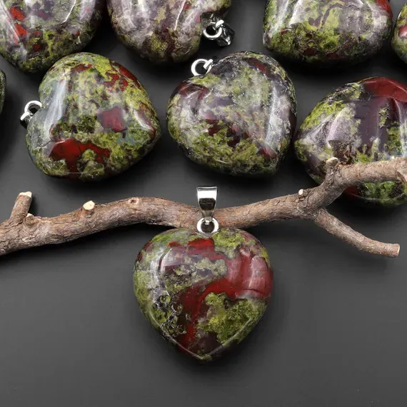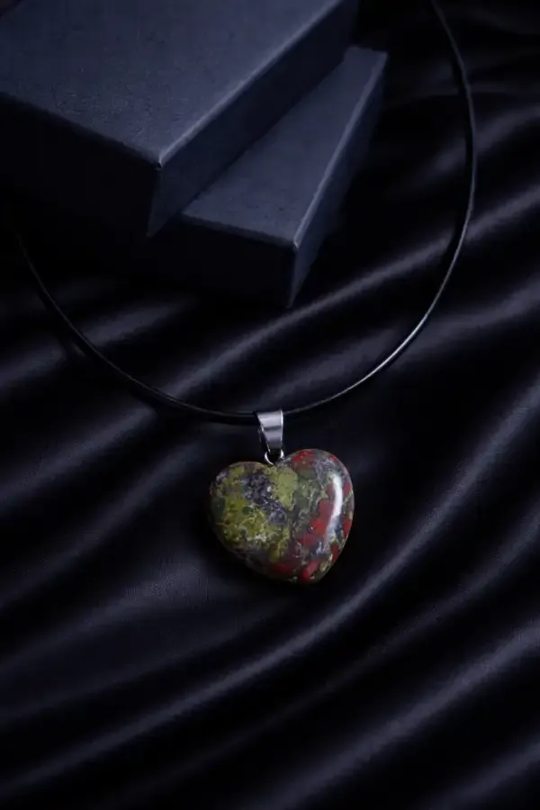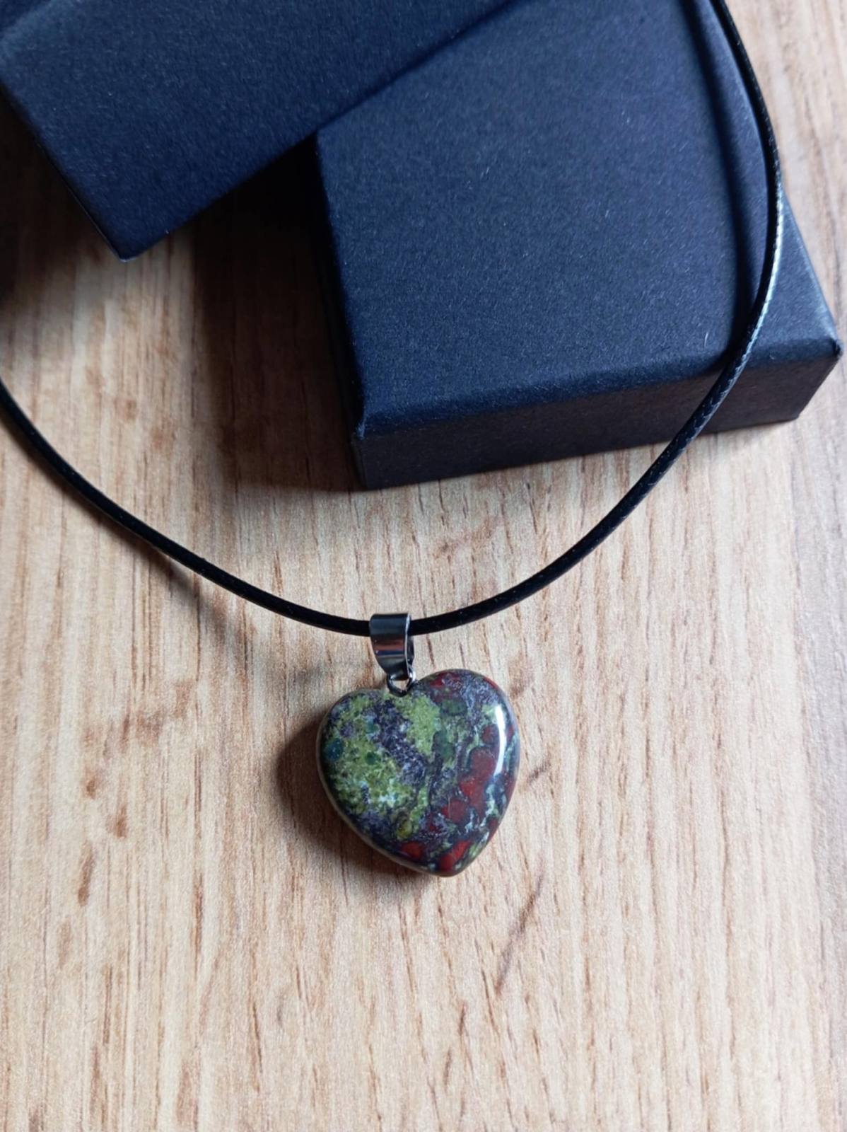 Naravni obesek v obliki srca iz Zmajeve krvi (Dragon Blood Jasper) je močan kristal vitalnosti, moči in poguma. Njegova zelena barva simbolizira rast, zdravljenje in povezavo z naravo, medtem ko rdeči vzorci predstavljajo življenjsko energijo in strast. Ta kamen je znan kot zaščitnik srca, saj podpira čustveno ravnovesje, krepi voljo ter prinaša moč za premagovanje izzivov.