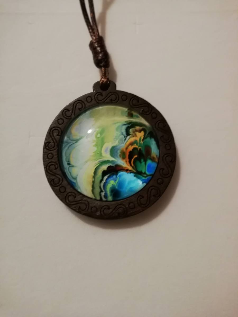 UNIKATNA Ogrlica z medaljonom iz lesa in energijskim barvnim diagramom
