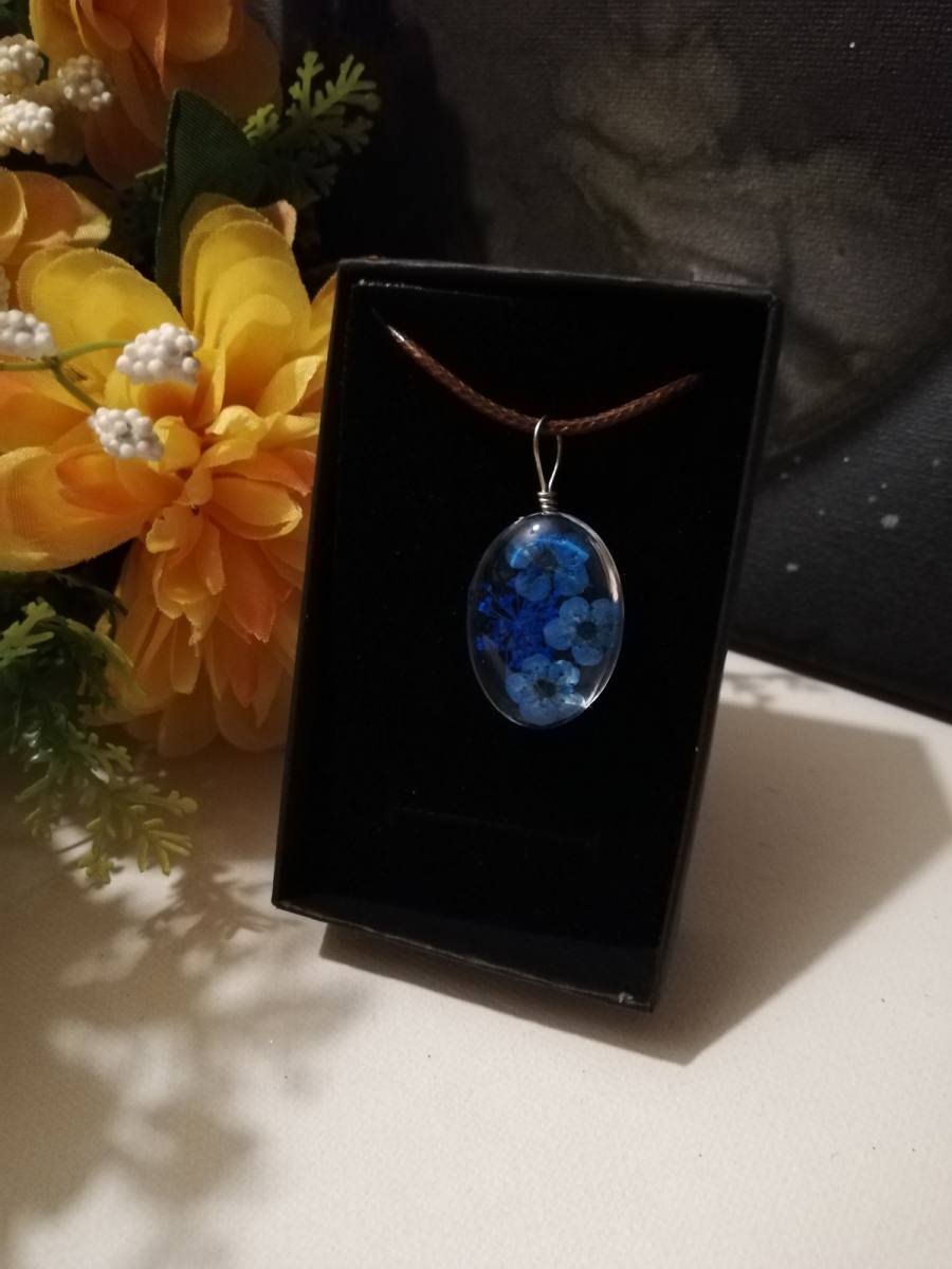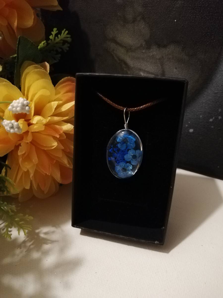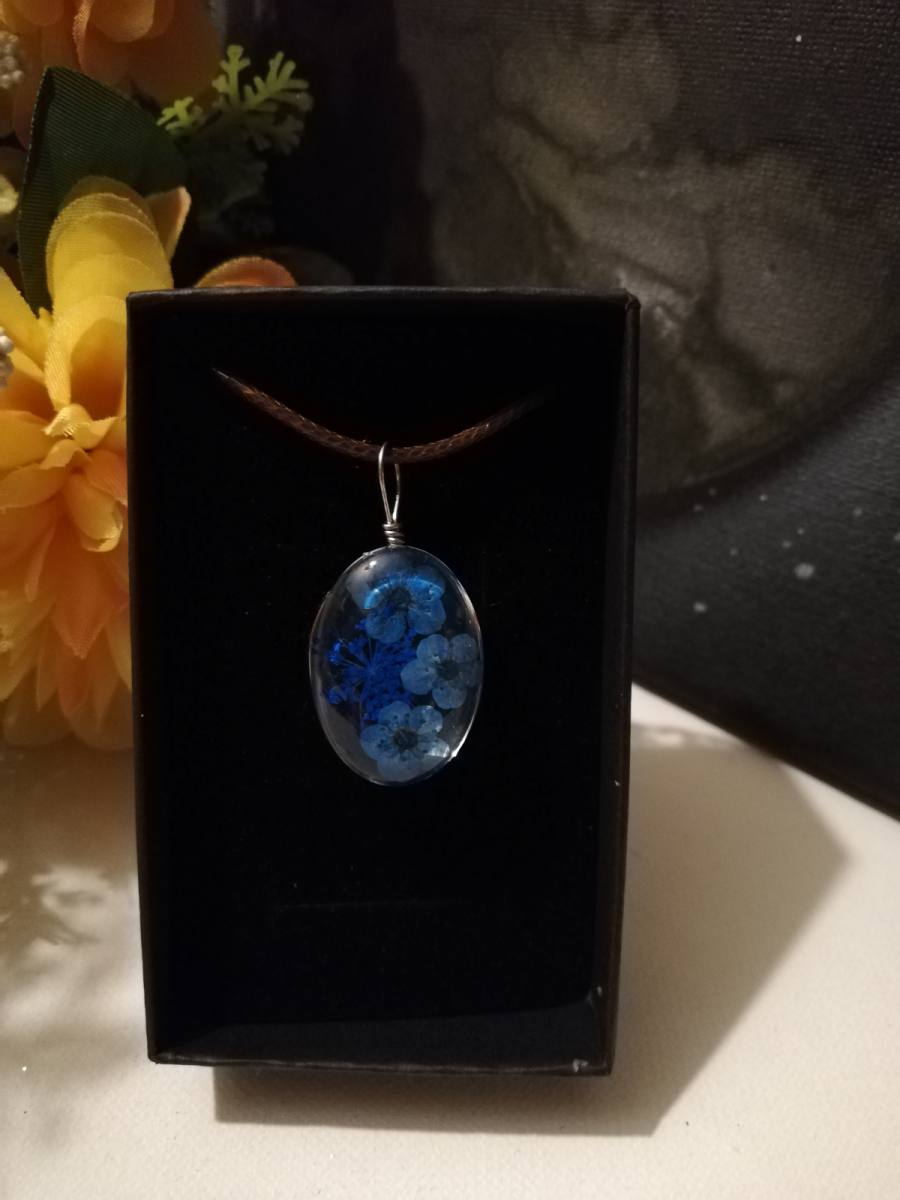 Osnova ogrlice je močna črna bombažna vrvica. Obesek je iz stekla-kristalne mase v kateri je vdelano suho prešano cvetje.