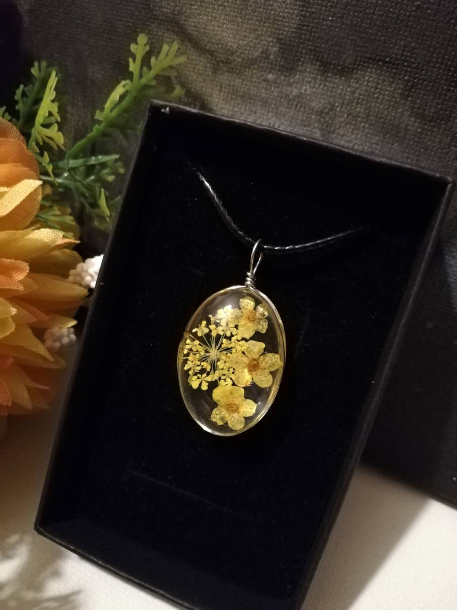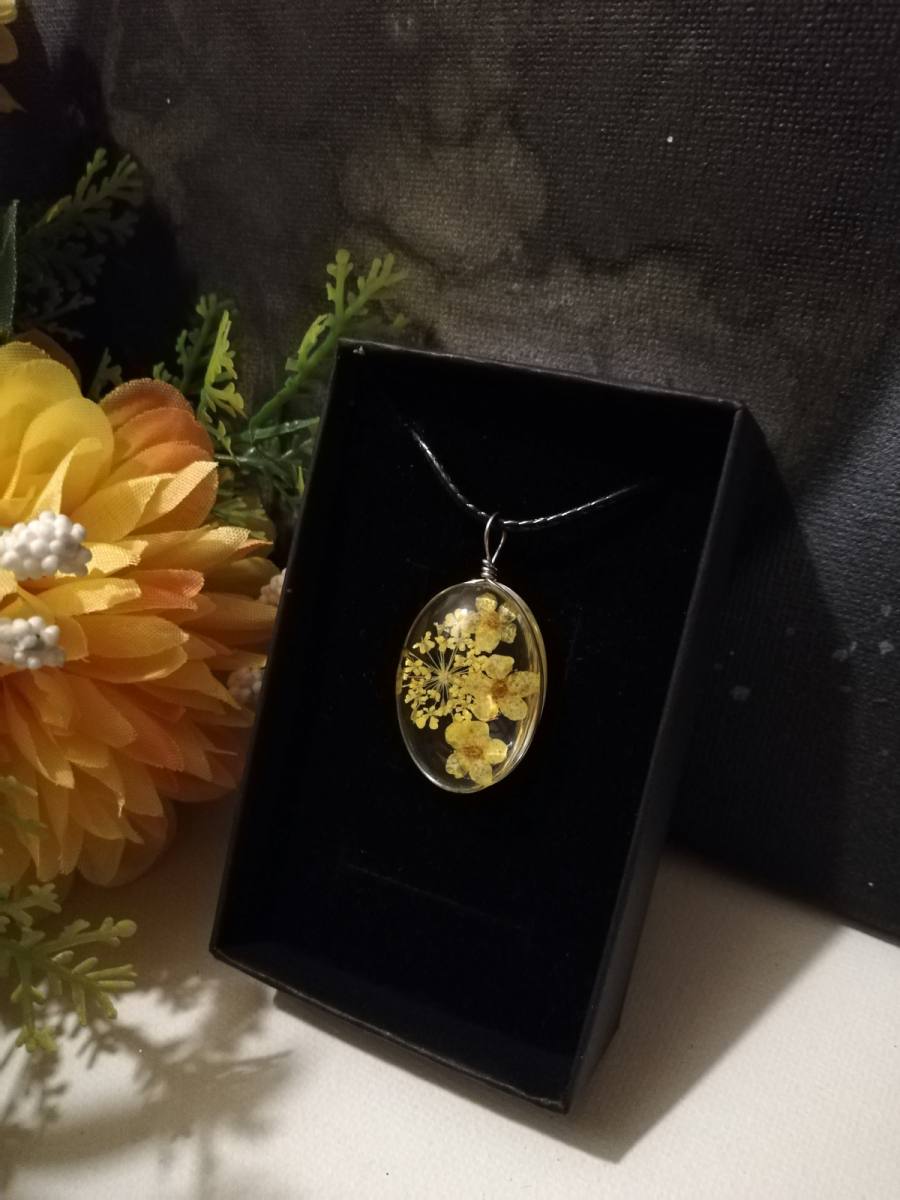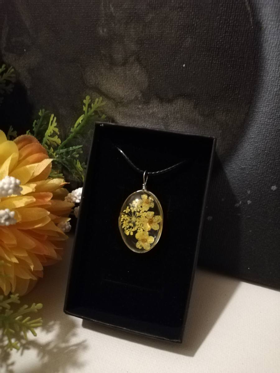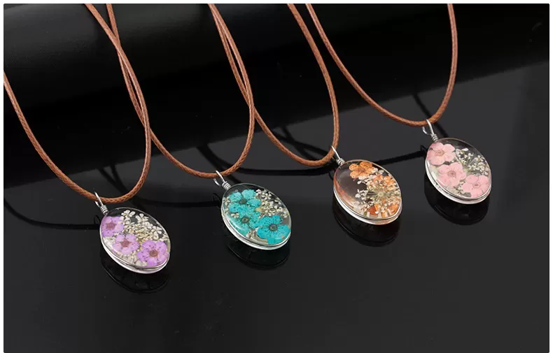 Osnova ogrlice je močna črna bombažna vrvica. Obesek je iz stekla-kristalne mase v kateri je vdelano suho prešano cvetje.