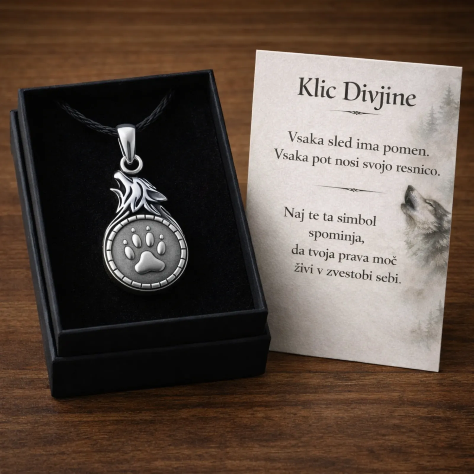 Ko nosiš ta obesek, nosiš moč volka – bitja, ki hodi svojo pot, zaupa instinktu in ostaja zvest sebi in svojemu krdelu. Volčja šapa predstavlja sled, ki jo puščaš za seboj. Opominja te, da vsak tvoj korak nekaj pomeni in da tvoja prisotnost ni nikoli tiha ali nepomembna.
