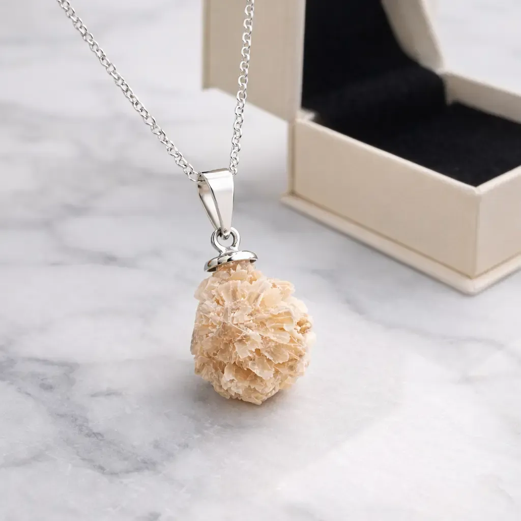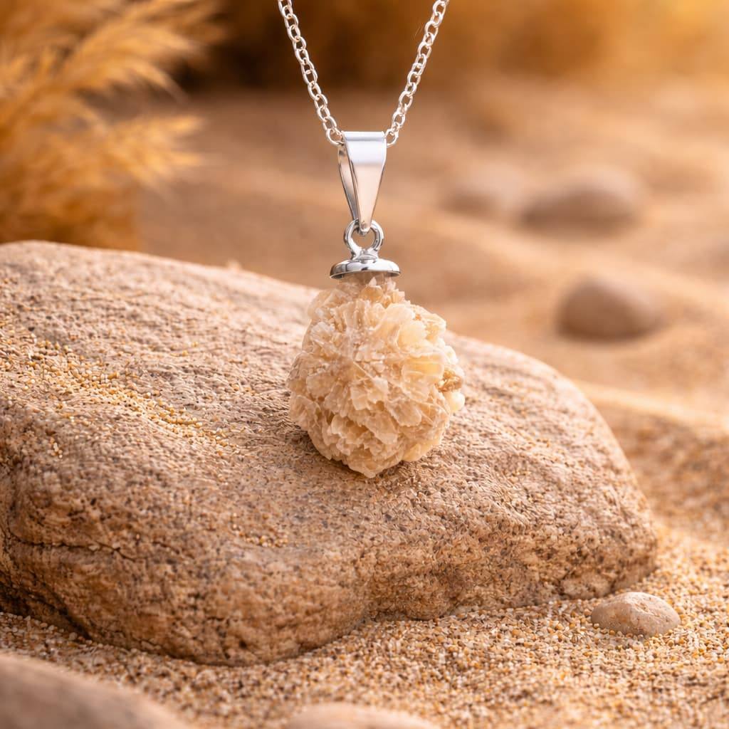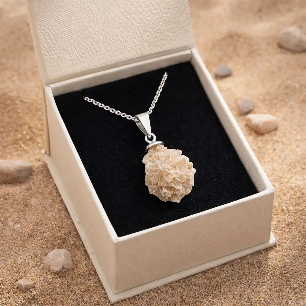 Puščavska roža je tudi simbol rasti in novih začetkov. Tako kot se kristal oblikuje počasi in potrpežljivo, nas opominja, da ima vsak proces v življenju svoj čas. Nositi ta obesek pomeni nositi sporočilo narave: da tudi v najbolj suhih in zahtevnih obdobjih lahko zacveti nekaj izjemnega.
