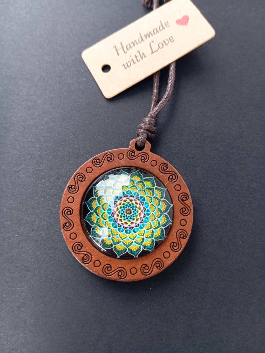 Večni Krog – Lesena Ogrlica z Mandalo je čudovit spoj naravnih elementov in duhovne simbolike, ki prinaša ravnovesje, harmonijo in globoko povezanost z naravo. Ta unikatna ogrlica je izdelana iz skrbno izbranega lesa, ki predstavlja moč in stabilnost, medtem ko je v središče vdelana steklena mandala, ki s svojo kompleksno geometrijo simbolizira večno cikličnost življenja in neprekinjen tok energije.