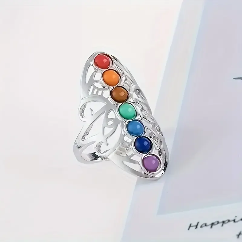 Prebudite svojo notranjo energijo s čudovitim prstanom, ki simbolizira sedem glavnih čaker – energetskih središč telesa, ki vplivajo na naše fizično, čustveno in duhovno počutje. Vsak kamen na tem elegantnem prstanu ustreza eni čakri in je skrbno izbran po barvi, ki odraža njen pomen in vibracijo.