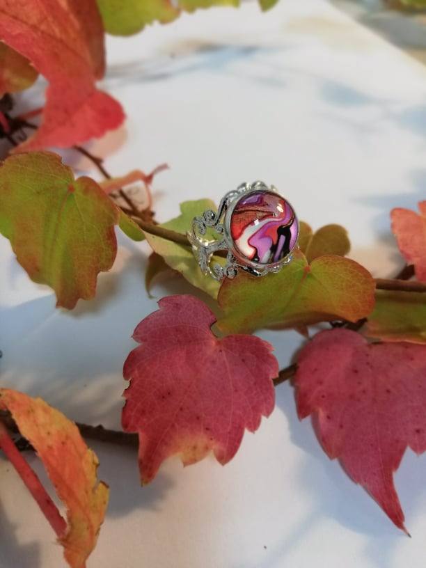 Prstan je ročno izdelan iz nastavljive kovinske osnove. Krasi ga steklena solzica pod katero je barvni vzorec različnih oblik in spektrov barv.