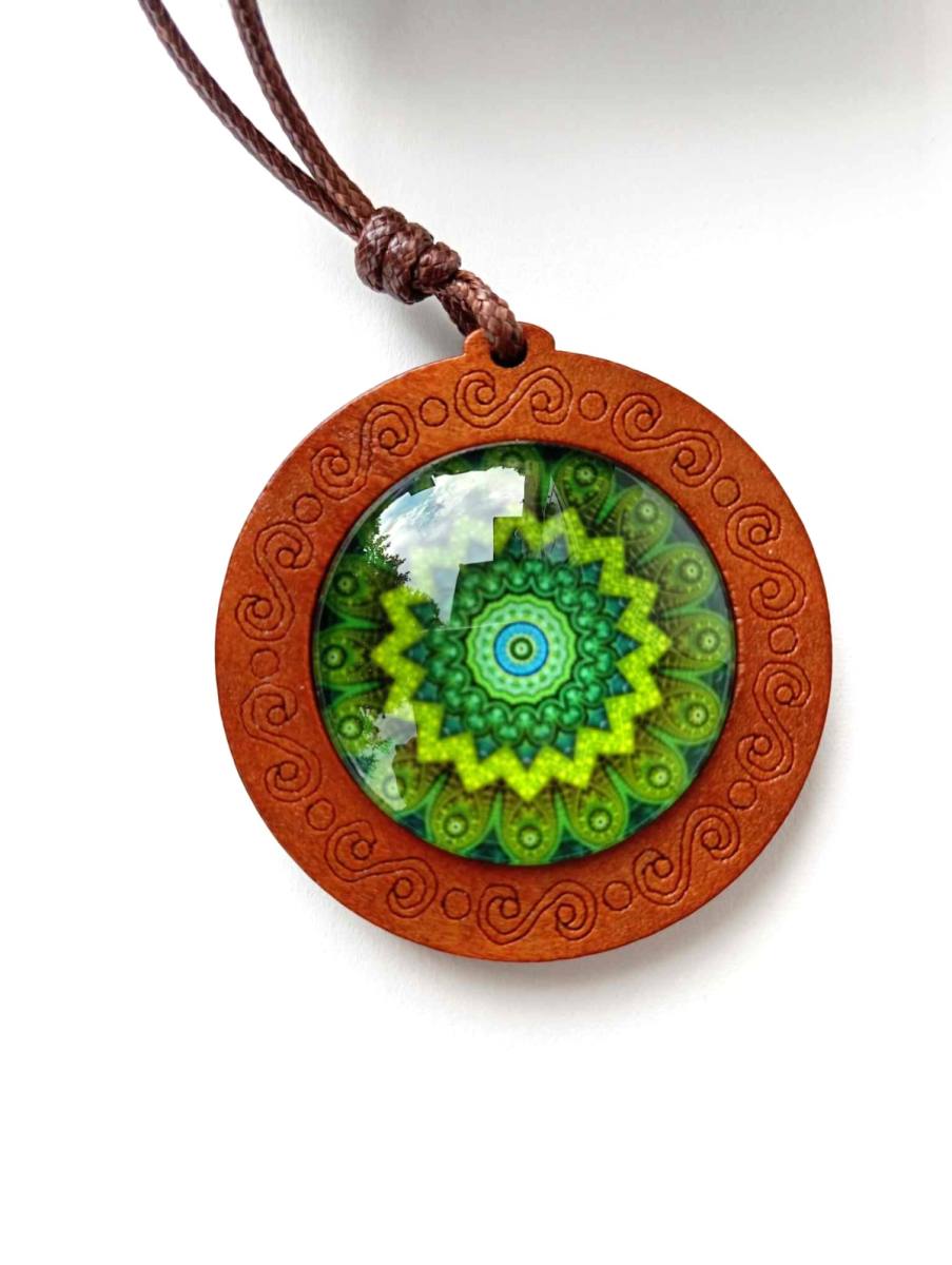 Večni Krog – Lesena Ogrlica z Mandalo je čudovit spoj naravnih elementov in duhovne simbolike, ki prinaša ravnovesje, harmonijo in globoko povezanost z naravo. Ta unikatna ogrlica je izdelana iz skrbno izbranega lesa, ki predstavlja moč in stabilnost, medtem ko je v središče vdelana steklena mandala, ki s svojo kompleksno geometrijo simbolizira večno cikličnost življenja in neprekinjen tok energije.