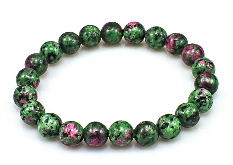 Osrednji kamen zapestnice, rubin v zoisitu, združuje moči rdeče in zelene barve – energijo strasti in srčne topline ter miru in duhovne rasti. Rubin je simbol brezpogojne ljubezni, podpira srčno čakro in spodbuja ljubezen do sebe in drugih. Zoisit, ovit okoli rubina, deluje kot zdravilni most med telesom in dušo, spodbuja regeneracijo in ustvarja prostor za osebno preobrazbo. Skupaj ti kamni tvorijo močno energetsko polje, ki privablja ljubezen, zaščito in pozitivnost.