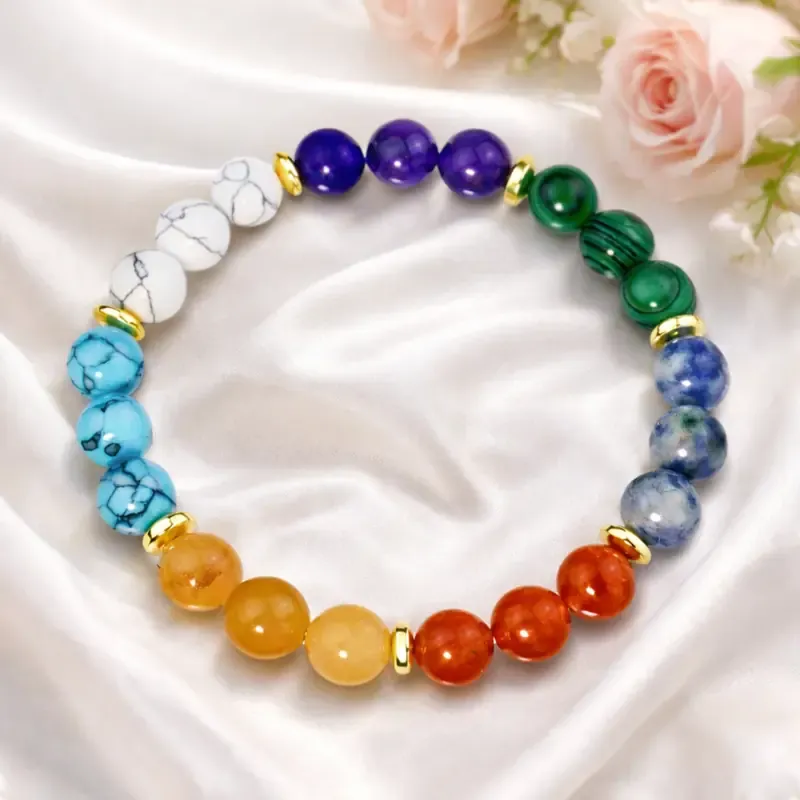 Ta čudovita čakra zapestnica iz naravnih kamnov je zasnovana za uravnoteženje sedmih glavnih energijskih centrov v telesu. Vsak kamen predstavlja eno čakro in podpira njen pretok energije, kar prinaša harmonijo, notranji mir in vitalnost.