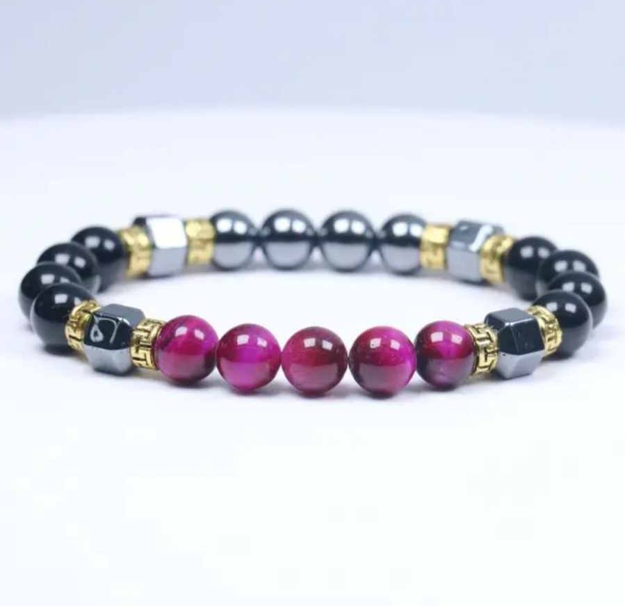 V teh zapestnicah se srečujejo tri močne energije. Barvno tigrovo ali mačje oko deluje kot energijski prevodnik, ki nežno odpira specifične čustvene tokove in notranje uvidenje. Obsidian je zaščitnik – močan, temen kamen, ki deluje kot ogledalo resnice in hkrati kot ščit pred zunanjimi vplivi. Hematit pa prinaša globoko stabilnost in prizemljitev, usmerja tvojo energijo navznoter in ti pomaga ohranjati jasnost tudi v čustvenem kaosu.