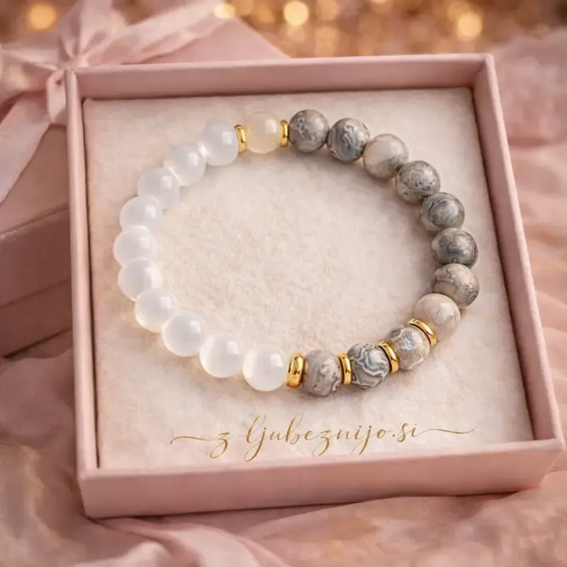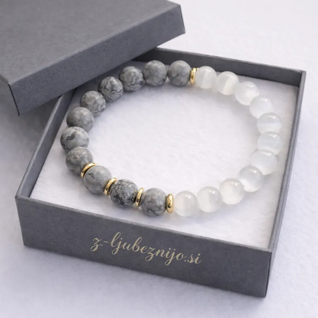 V zapestnici se prepletata dva izjemna naravna kamna: sivi jaspis in selenit.