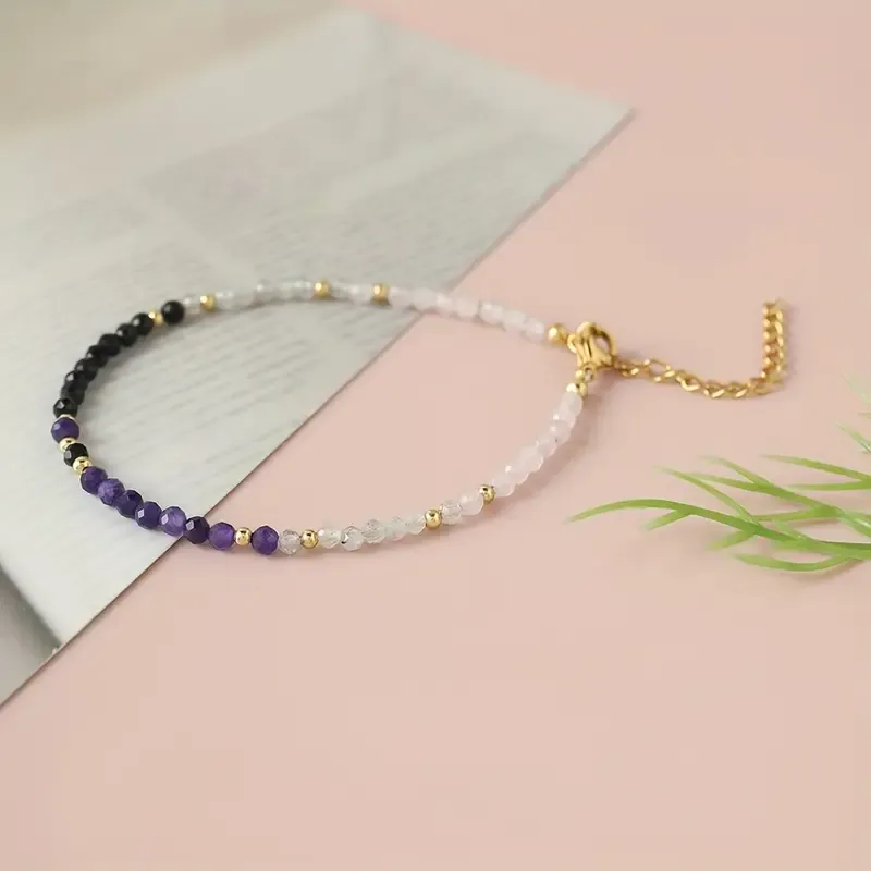 Ta prefinjena zapestnica združuje naravne fasetirane kristale ametista, obsidiana, roževca in kamene strele, ki skupaj ustvarjajo uravnoteženo energijsko kombinacijo zaščite, miru in ljubezni. Zlati vmesniki ji dodajo eleganco in pridih razkošja.