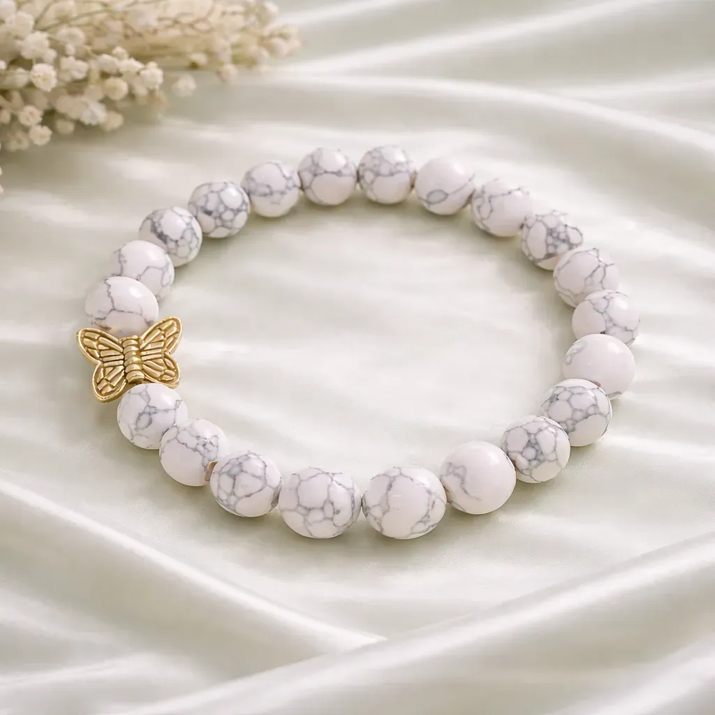 Z vsakim nošenjem te zapestnice boste začutili povezavo z notranjim virom moči in upanja, ki je vedno prisoten v vas, tudi ko se zdi, da so okoli vas oblaki. Naravni kamni te zapestnice delujejo kot duhovna podpora, ki vas prizemljujejo in krepijo vašo vero v življenje, medtem ko metulj nežno šepeta, da ne glede na to, kako temna je lahko noč, vedno prihaja zora.