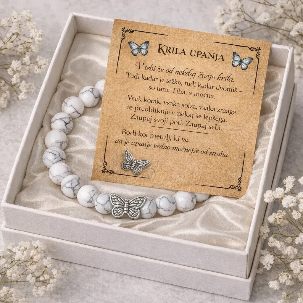 Zapestnica "Krila Upanja" je čarobni simbol preobrazbe, vere in upanja, ustvarjena za vse, ki v življenju iščejo luč in spodbudo v trenutkih preizkušenj. Navdihnjena z nežnim metuljem, ki simbolizira preobrazbo in ponovno rojstvo, ta zapestnica nosi v sebi globoko sporočilo o moči vztrajanja in neskončnih možnosti, ki čakajo vsakogar na njegovi poti.