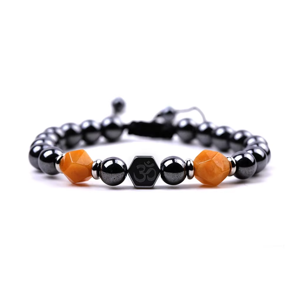 V središču zapestnice je hematitna ploščica z vgraviranim simbolom OM, ki predstavlja prvotni zvok stvarstva in izvor vse manifestacije. OM v kombinaciji s citrinom deluje kot energijski kanal, ki uskladi tvoje namere z univerzalnim tokom. Pomaga ti začutiti trenutek, ko so misel, srce in dejanje v popolni harmoniji – in prav takrat nastane obilje.