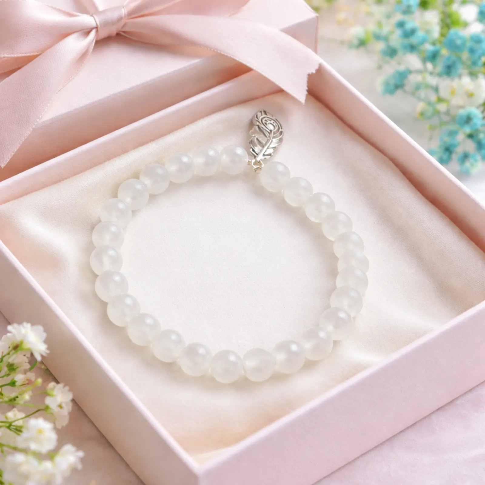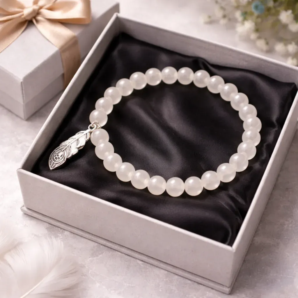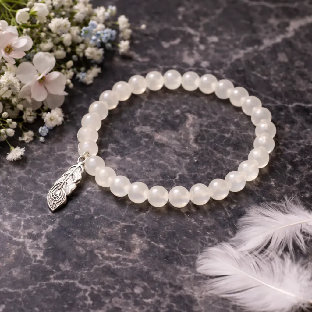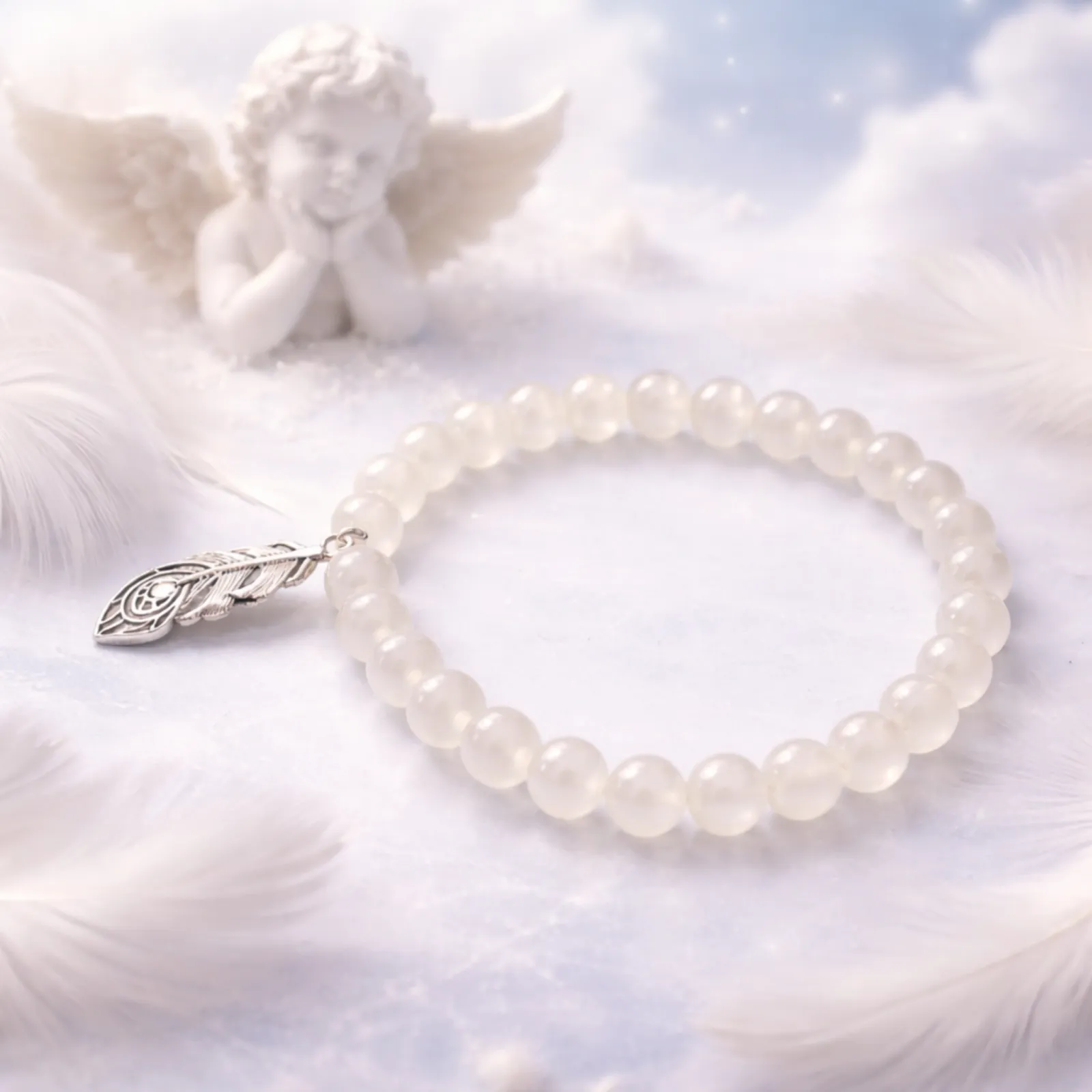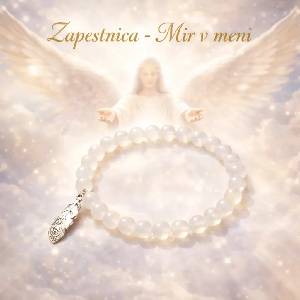 Zapestnica Mir v meni je ustvarjena kot tih, svetel simbol notranjega miru, zaščite in nežne podpore. Njena svetla, mlečna barva deluje pomirjujoče in čisto, kot mehak dih svetlobe, ki nas objame v trenutkih, ko potrebujemo umiritev in zbranost. Obesek v obliki peresa nosi angelsko simboliko – lahkotnost, varnost in občutek, da nismo nikoli sami na svoji poti.