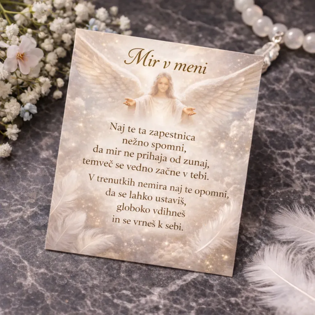 Perje že od nekdaj velja za znamenje angelske prisotnosti in zaščite. Predstavlja lahkotnost misli, svobodo srca in nežno moč, ki ne potrebuje glasnosti. Mir v meni je namenjena vsem, ki si želijo več ravnovesja, notranje jasnosti in občutka varnosti v vsakdanjem življenju.