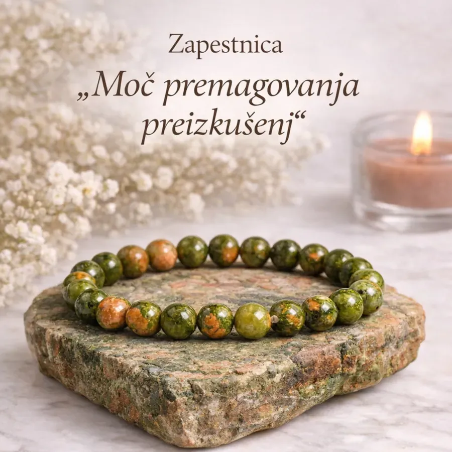 Zapestnica "Moč premagovanja preizkušenj" je talisman notranje moči, duhovne vztrajnosti in globoke preobrazbe. Sestavljena je iz unakita, kristala, ki združuje energijo zemlje in srca ter v sebi nosi skrivnosti starodavnih znanj o zdravljenju duše in osvobajanju bremen preteklosti.