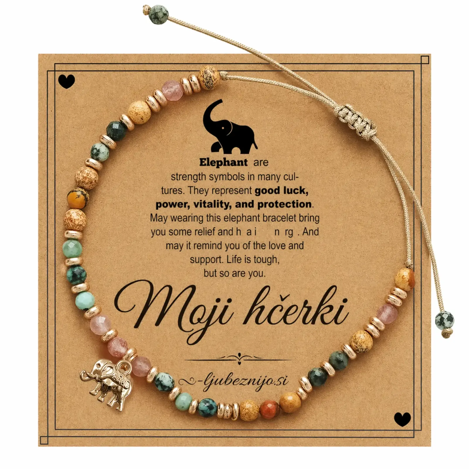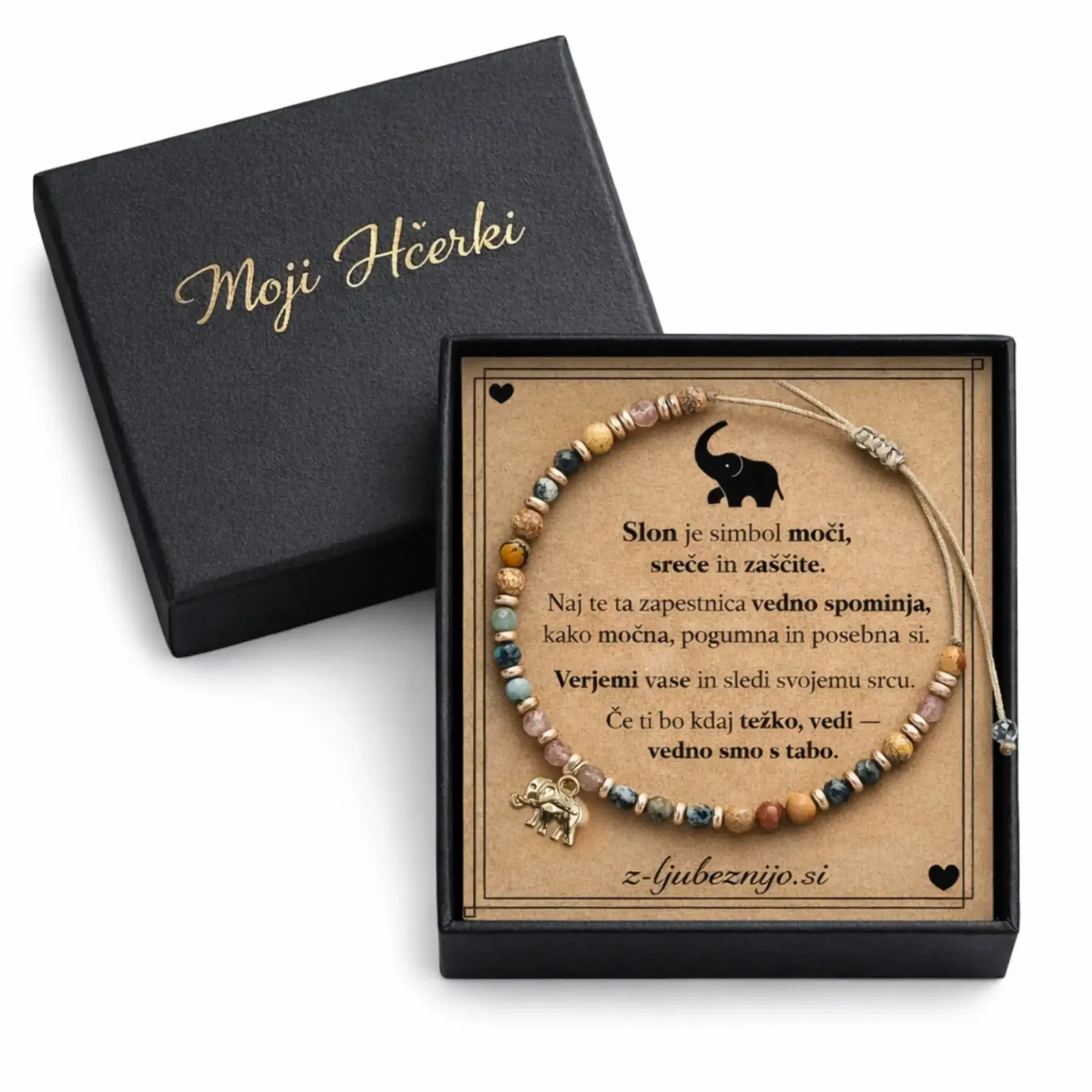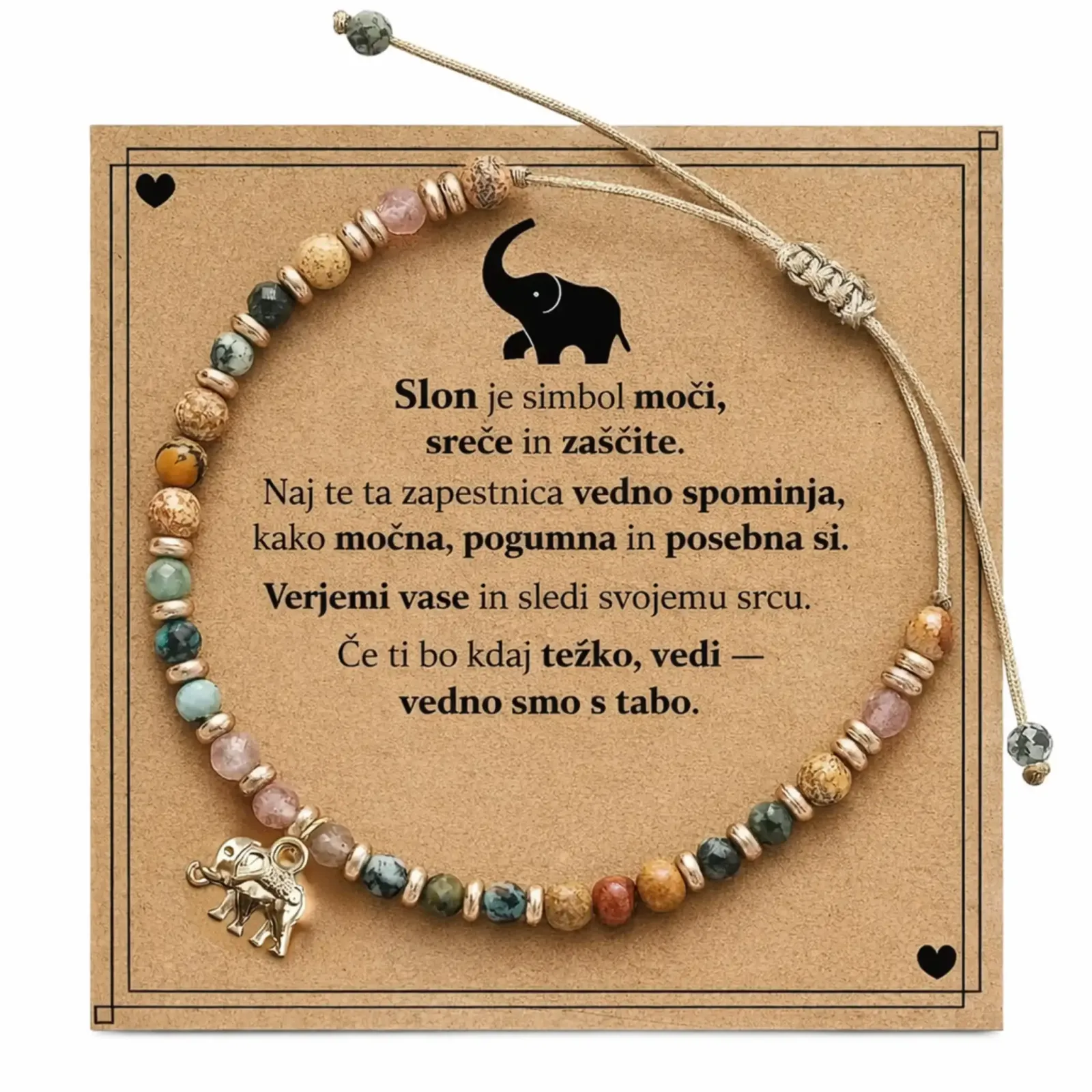 Včasih besede niso dovolj – zato obstajajo darila, ki govorijo s srcem. Ta nežna zapestnica, ustvarjena z ljubeznijo iz naravnih kristalov in simbolom slončka za srečo, nosi v sebi globoko sporočilo:
