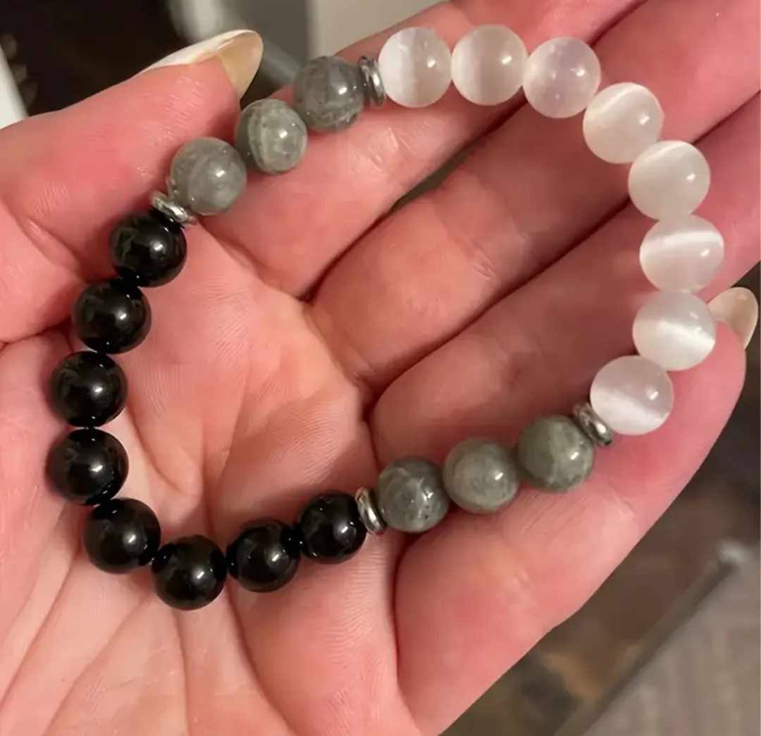 Zapestnica Most med svetovi je energetski talisman, ki simbolizira povezavo med tem svetom, v katerem živimo, in svetovi, iz katerih smo prišli ter kamor se bomo nekoč vrnili. Vsak kristal, ki sestavlja to zapestnico, nosi globoko simboliko prehoda, večnosti in duhovne povezanosti z dimenzijami onkraj vidnega.