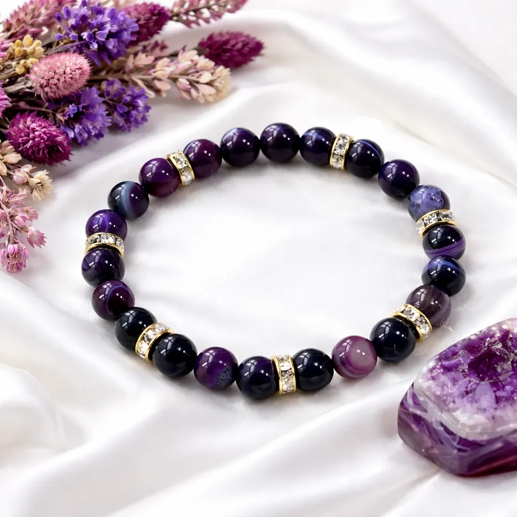 Osrednji kamen zapestnice je viola ahat, znan po svoji umirjajoči in stabilizirajoči energiji. Njegovi mehki vijolični odtenki simbolizirajo notranji mir, zaščito in čustveno ravnovesje. Viola ahat podpira občutek varnosti, pomaga prizemljiti razpršene misli ter spodbuja nežno povezavo s sabo – brez pritiska, brez hitenja.