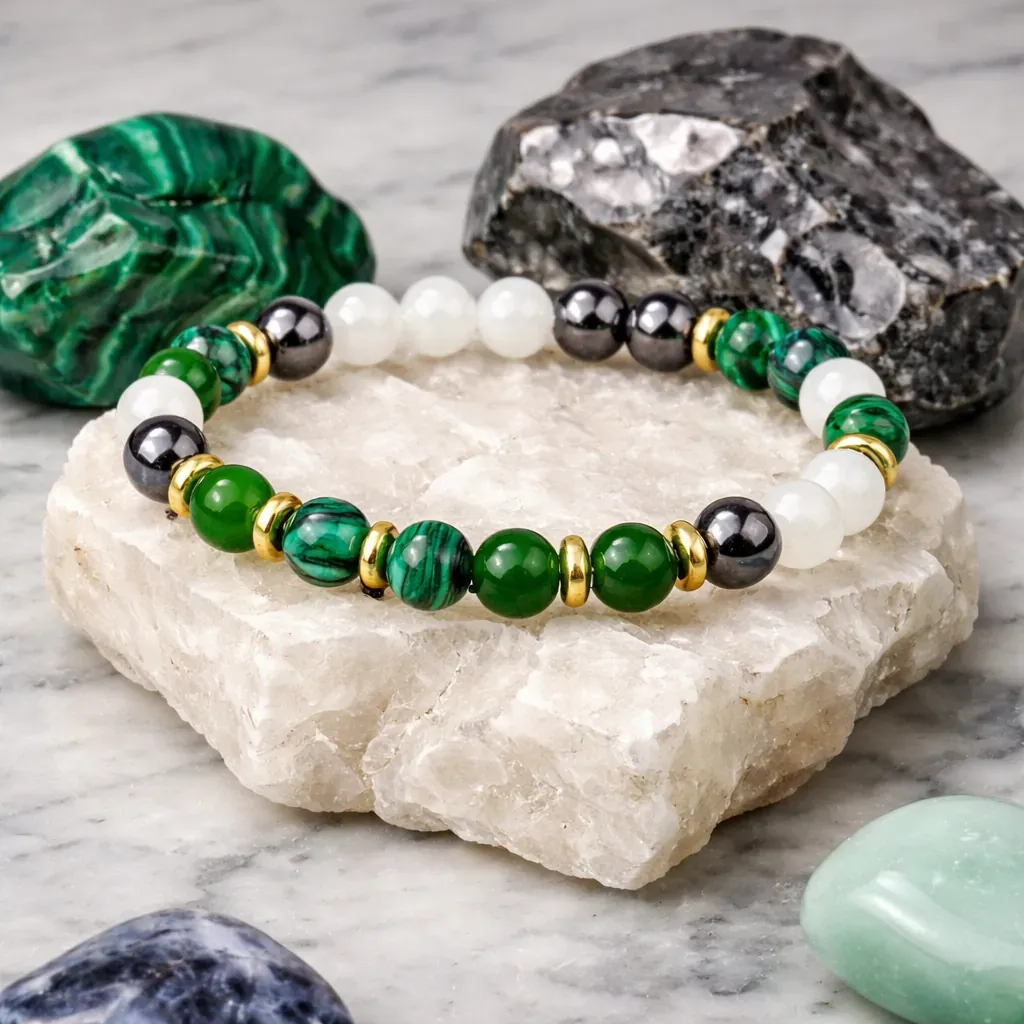 Malahit, kamen globoke transformacije, nežno, a vztrajno prinaša na površje tisto, kar je pripravljeno oditi. Pomaga pri spuščanju starih čustvenih vzorcev, strahov in potlačenih skrbi ter nas uči, da je sprememba naraven del rasti. Njegova zelena energija zdravi srčni prostor in spodbuja notranjo iskrenost do sebe.