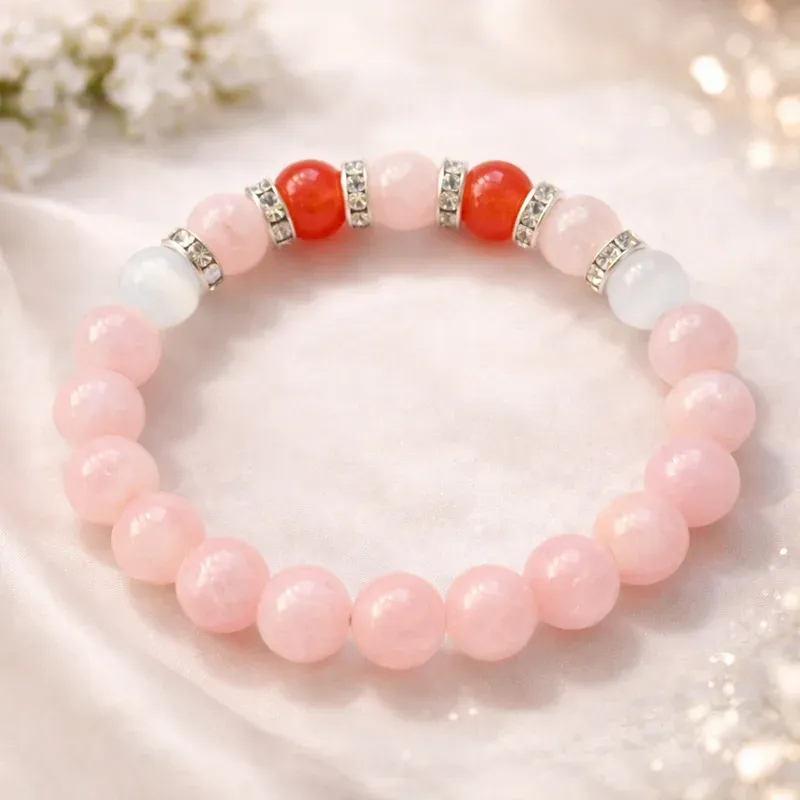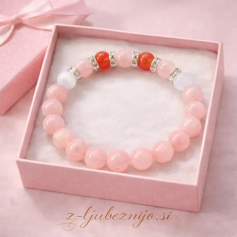 Zapestnica Svetloba srca je ustvarjena kot nežen opomnik, da se prava moč vedno rodi v srcu. Združuje tri izjemne kristale – roževec, karneol in selenit – v harmonično celoto, ki nagovarja čustva, notranji mir in življenjsko energijo.