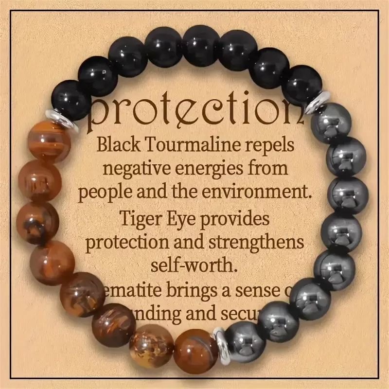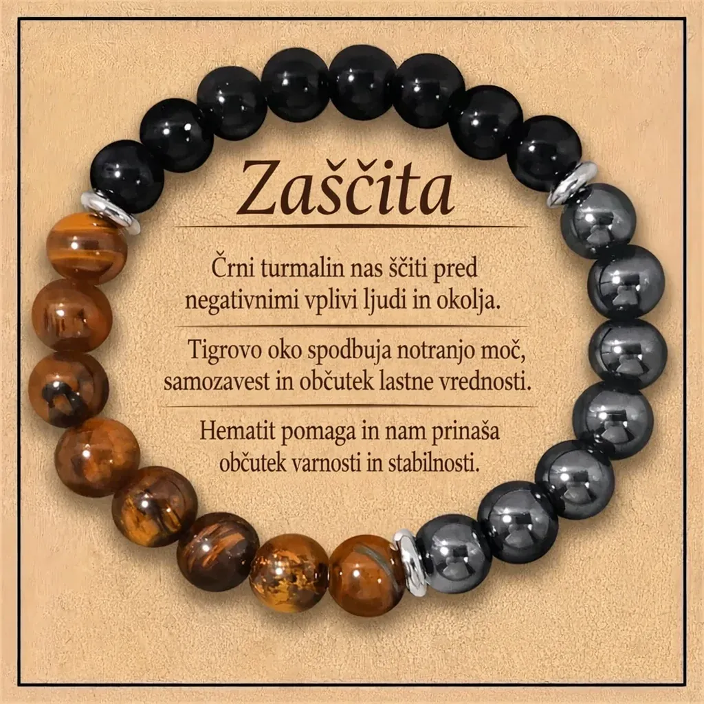 Zapestnica "Trikratna zaščita" je močan duhovni talisman, oblikovan z namenom, da vas varuje in podpira na vseh ravneh vašega življenja. Združuje tri izjemno močne kristale – tigrovo oko, hematit in obsidian – ki skupaj tvorijo močno energijsko zaščito. Vsak od teh kristalov prinaša svoje edinstvene lastnosti, v zapestnici pa se prepletajo v popoln ščit pred negativnimi vplivi.