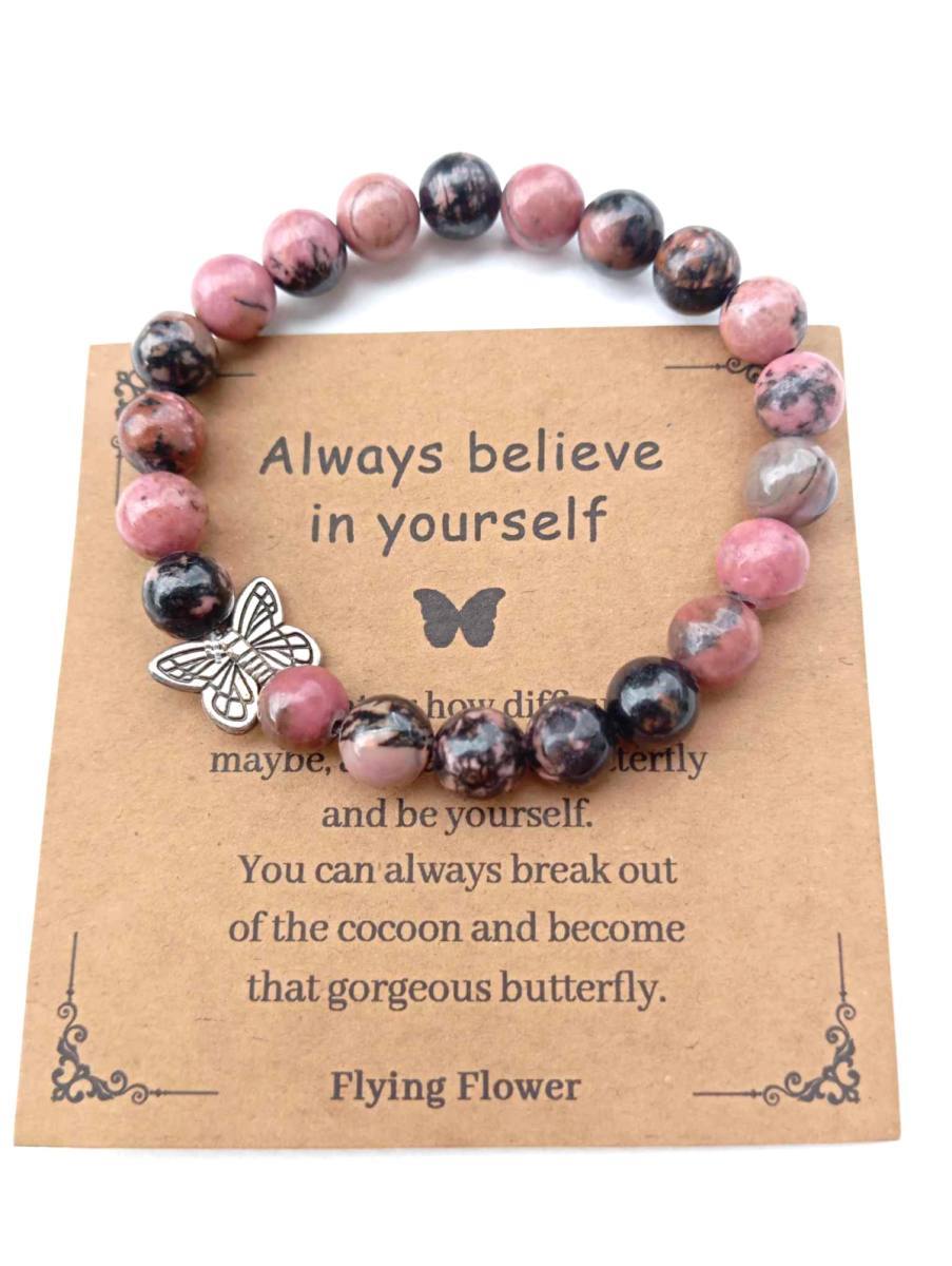 Zapestnica "Verjemi vase in svojo moč" je simbol notranje preobrazbe in moči, ki jo nosimo globoko v sebi, tudi takrat, ko je ne prepoznamo takoj. Ta prelepa zapestnica, izdelana iz kamnov v imitaciji rodonita, nas nežno opominja, da je naša notranja moč vedno prisotna, tudi v trenutkih, ko se počutimo negotove, ranljive ali dvomimo vase.