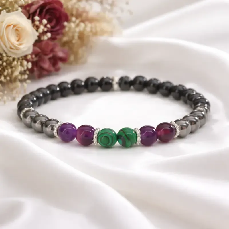 Malahit v zapestnico prinaša energijo čustvene preobrazbe. Je kamen, ki pomaga pri sproščanju potlačenih občutkov, starih čustvenih vzorcev in notranjih blokad. Njegova energija podpira nežne, a globoke spremembe ter pomaga, da se čustva uravnovesijo na naraven način. Malahit spodbuja zavedanje in sprejemanje, kar je ključno za občutek notranjega miru.