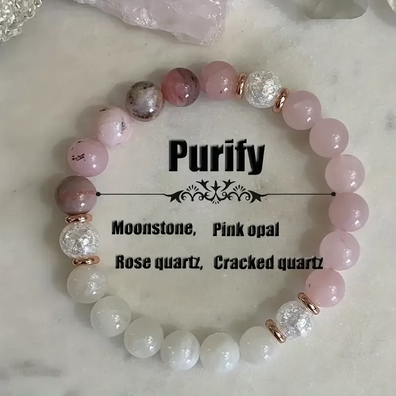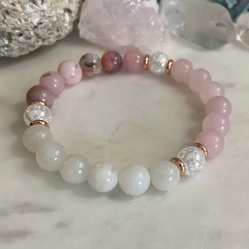 Zapestnica "Zdravljenje Srca" je zasnovana kot nežna energijska podpora za vse, ki si želijo sprostiti čustvene rane preteklosti, očistiti svoje srce starih energij in se pripraviti na sprejemanje prave ljubezni. Izdelana iz roževca, kristala brezpogojne ljubezni, in mesečevega kamna, simbola intuicije in preobrazbe, ta zapestnica deluje kot zdravilni most med preteklimi čustvi in ljubeznijo, ki je v srcu vedno prisotna.