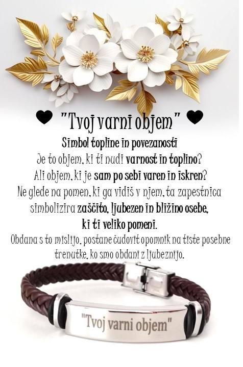 Vsaka zapestnica nosi svoj unikaten zapis, besede, ki jih pogosto čutimo, a jih premalokrat izrečemo. "Tvoj varni objem" je obljuba, da nekje obstaja prostor, kamor se lahko vrnemo, ne glede na to, kam nas ponese življenje. Napisi so različni – nekateri izražajo zaščito, drugi podporo, ljubezen, neomajno povezanost. Vsaka beseda je iskren poklon vezi, ki jo nosimo v srcu.
