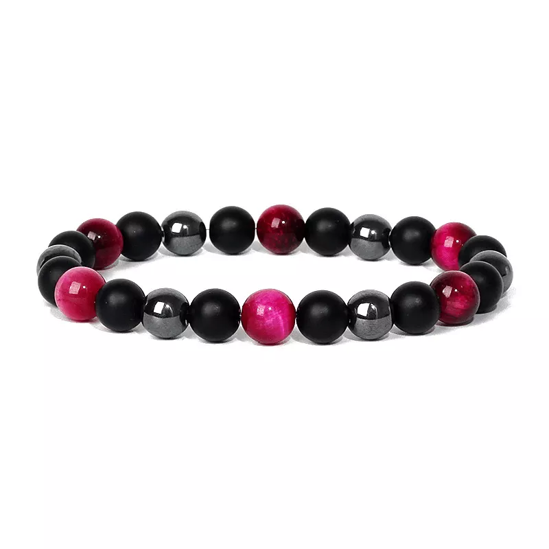 Ta zapestnica ZA ZAŠČITO, ZDRAVLJENJE in MOČ je sestavljena iz kroglic tigrovega očesa, črnega obsidijana in hematita.