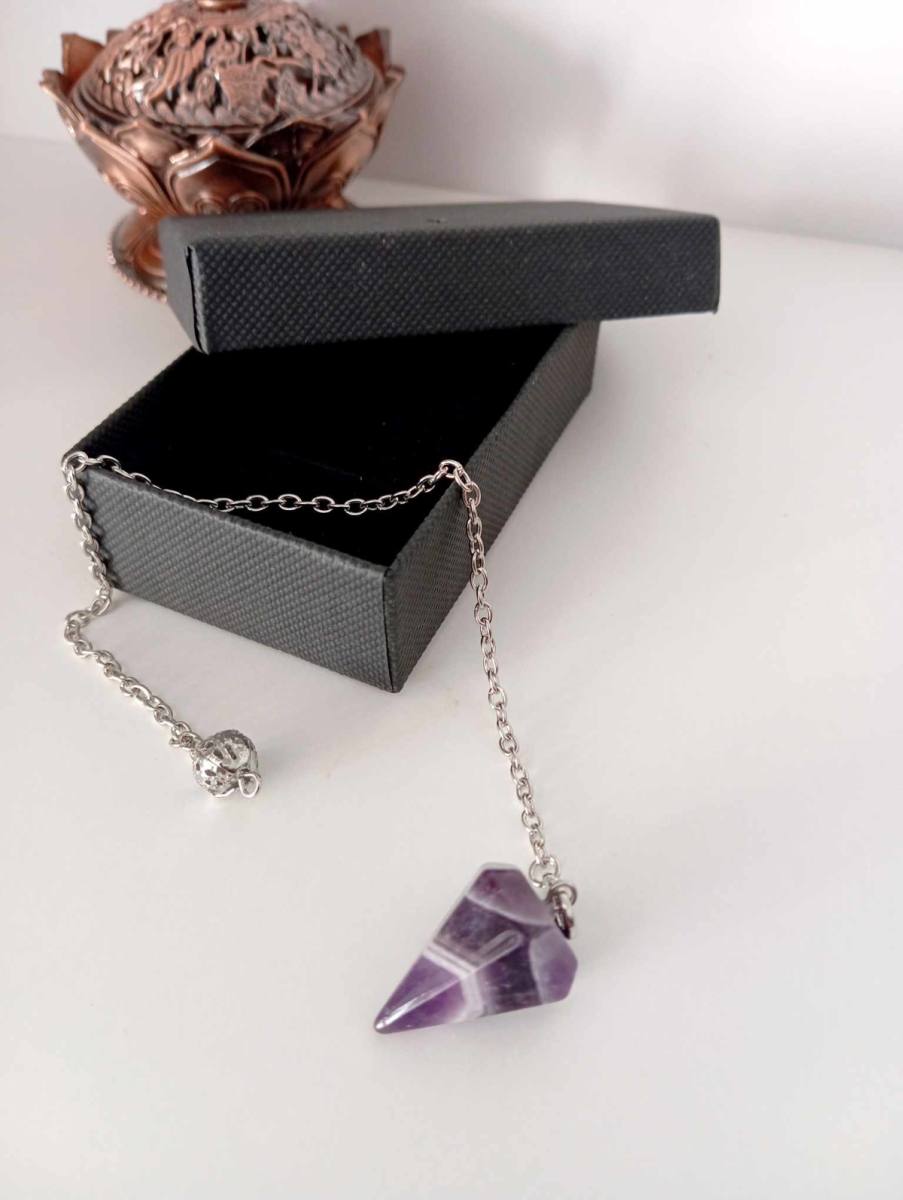 Ametist je kristal, ki že od nekdaj velja za simbol duhovne moči, notranje umirjenosti in zaščite. Njegova čudovita vijolična barva odseva globoko povezanost z višjimi dimenzijami ter prinaša energijo jasnosti in razsvetljenja. Ta kristal pomaga odpraviti dvome, umiriti um in omogočiti boljši dostop do lastne intuicije. Ko ga uporabljaš kot nihalo, ti pomaga prepoznati resnico, preseči iluzije in prejeti natančne odgovore iz svoje podzavesti ali duhovnega vodstva.