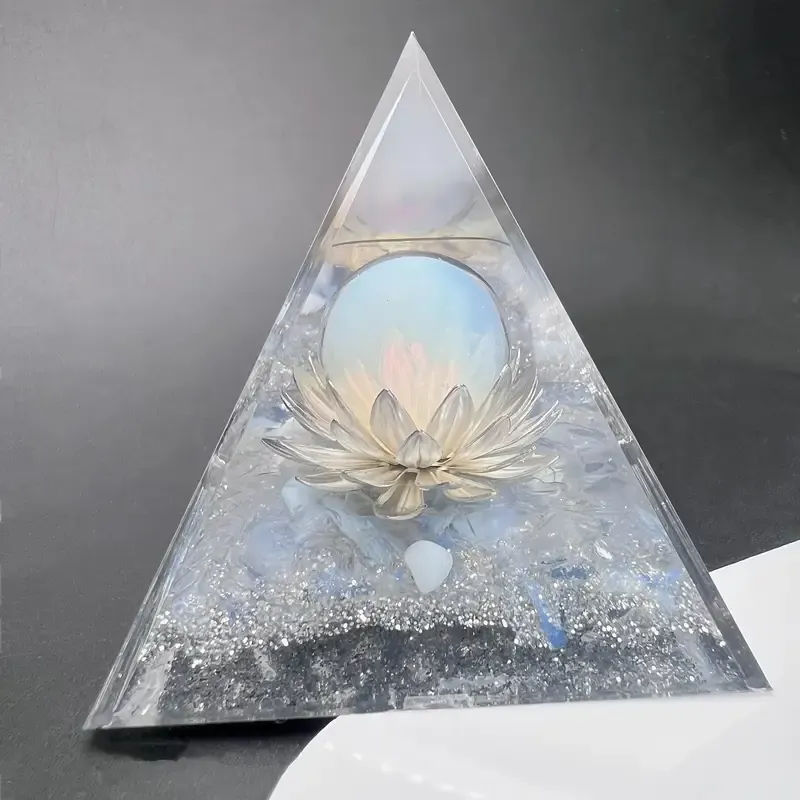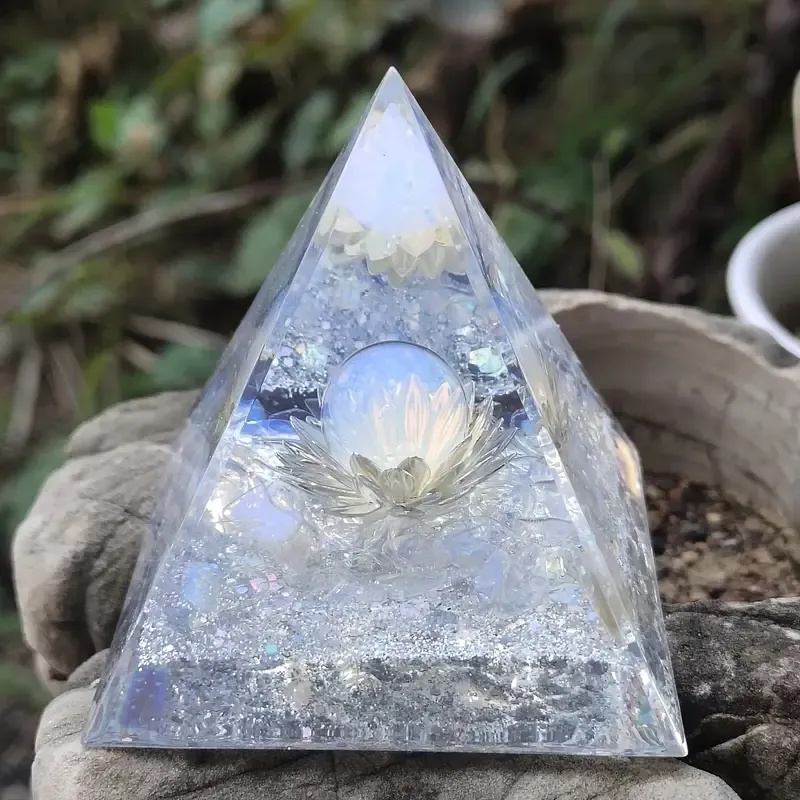 V središču piramide se nahaja simbol lotosa — znak čistosti, preporoda in duhovne rasti. Prosojna in sijoča zasnova piramide deluje nežno in hkrati močno, kar jo naredi odlično za spalnico, meditacijski kotiček, dnevno sobo ali delovno okolje.