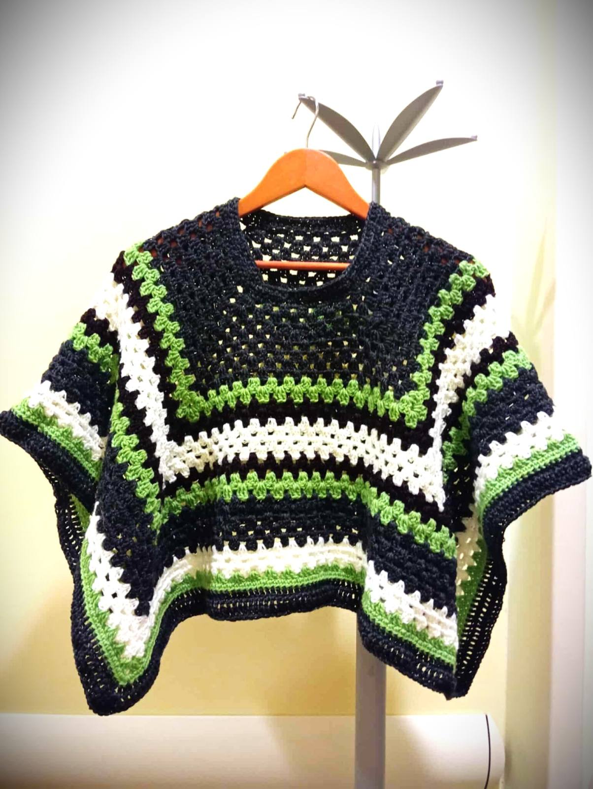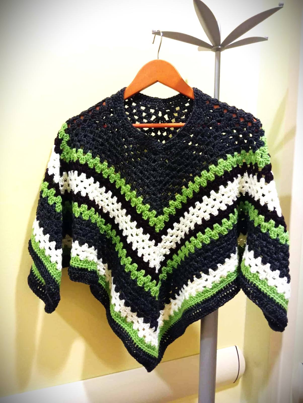 Ta unikatni ročno kvačkani pončo je eleganten in praktičen kos, ki ga lahko nosite skozi vse leto. Sestavljen je iz harmonične kombinacije zelene, bele, rjave in črne barve, ki se zlahka ujema z različnimi stili in kosi v vaši garderobi.