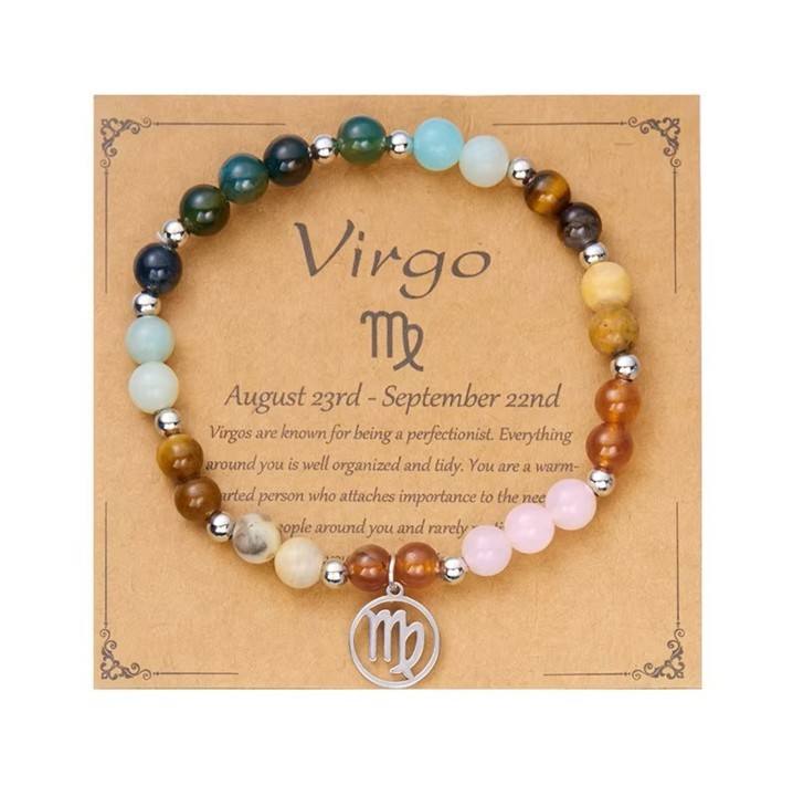 Naravni kristali na zapestnici Devici prinašajo sprostitev in občutek lahkotnosti. Kristali, ki so nastajali skozi dolge naravne procese v globinah zemlje, v sebi nosijo mirno, prizemljeno energijo. Ta energija Devici pomaga, da spusti pretiran nadzor in zaupa življenju. Kristali jo podpirajo pri soočanju s stresom, povečujejo notranji mir in ji pomagajo, da se odpre tudi svoji ustvarjalni in čustveni plati. Simbol Device na zapestnici poudari njeno sposobnost reda, skrbnosti in organizacije, kristali pa ji pomagajo, da te lastnosti uporablja brez izčrpavanja. Tako komplet postane njena opora na poti k ravnovesju med popolnostjo in sproščenostjo.
